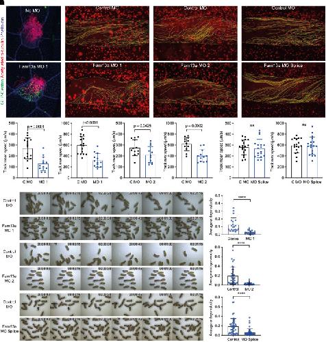 . Fam13a long-isoform knockdown in Xenopus laevis embryos affects epidermal cilia function. (A) Immunofluorescent images of X. laevis epidermis after coinjection of morpholino (MO) 1 and GFP-centrin (injection control). (B–D) Representative stills from Trackmate analysis of bead movement movies with control and (B) MO 1, (C) MO 2, or (D) MO Splice. (E–G) Quantification of Trackmate analysis with control (abbreviated as C) and (E) MO 1, (F) MO 2, or (G) MO Splice. Data indicate mean ± SD, unpaired t test. Tracks averaged across each embryo. (E) Control, n = 1,815 from 16 embryos; MO 1, n = 1,990 from 13 embryos; three independent experiments. (F) Control, n = 1,510 from 12 embryos; MO 2, n = 2,018 from 12 embryos; two independent experiments. (G) Control, n = 2,893 from 18 embryos; MO Splice, n = 2,604 from 18 embryos; three independent experiments. (H–J) Stills from brightfield movies of X. laevis embryo drift and quantification of embryo movement with control and (H) MO 1, (I) MO 2, or (J) MO Splice. Data indicate mean ± SD, unpaired t tests with Welch’s correction, P < 0.0001. (H) Twenty embryos, two independent experiments. (I) Control, n = 34 embryos; and MO 2, n = 43 embryos, three independent experiments. (J) Control, n = 34 embryos; MO Splice, n = 43 embryos; three independent experiments. ****P < 0.001. ns = not significant.