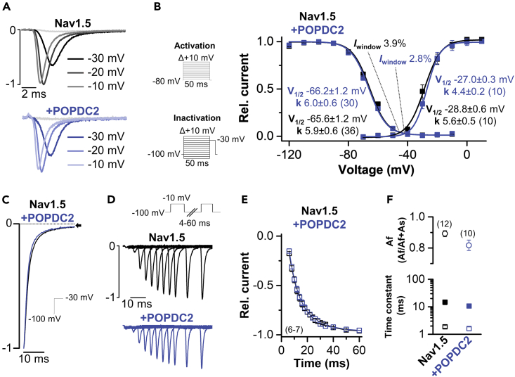 Figure 3. POPDC2 does not alter the current kinetics of Nav1.5(A) Current traces of human Nav1.5 expressed alone or co-expressed with human POPDC2. Representative traces are depicted at −30 mV, −20 mV and −10 mV.(B) Voltage-dependence of activation and inactivation curves fitted to a Boltzmann equation. The respective voltages of half-maximal activation (V1/2) together with the Boltzmann constants (k), as well as the window currents, are provided as inset. For the V1/2 of activation measurements, the currents were recorded with a P/N (N = 4) voltage-step protocol (holding potential −80 mV) and voltage-steps of 50 ms ranging from −70 to +80 mV in 10 mV increments (see inset activation protocol). For the V1/2 of inactivation measurements, the currents were recorded with a P/N (N = 4) voltage-step protocol (holding potential −100 mV) and voltage-steps of 50 ms ranging from −120 to −10 mV in 10 mV increments with a final step to −30 mV for 50 ms (see inset inactivation protocol). The number of technical replicates (n) is indicated in parentheses. Data are presented as mean ± s.e.m.(C) Representative current traces of the kinetics of inactivation recorded with a single-step protocol from −100 mV to −30 mV for 65 ms (inset illustrates voltage protocol).(D) Representative recordings of the recovery from inactivation (inset illustrates voltage protocol).(E) Time-course of the recovery from inactivation recorded with a two-pulse protocol, first step to −10 mV for 50 ms and the second test pulse stepped to −10 mV with increasing interpulse intervals. The number of technical replicates (n) is indicated in parentheses. Data are presented as mean ± s.e.m.(F) Time constants of the fast and slow component of the recovery from inactivation (lower panel) and the relative contribution of the fast and slow component (upper panel). Values were obtained by a bi-exponential fit from the data in (E). Oocytes were stored in a storage solution lacking theophylline. The number of technical replicates (n) is indicated in parentheses. Data are presented as mean ± s.e.m. See also Figure S3.