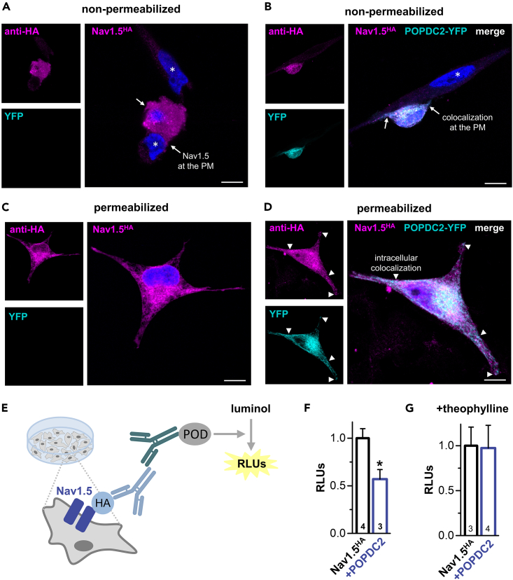 Figure 5. POPDC2 co-localizes with Nav1.5 at the plasma membrane and intracellular compartments and regulates the surface expression of Nav1.5 in a cAMP-dependent manner(A and C) HeLa cells were transfected exclusively with Nav1.5-HA or (B and D) in combination with POPDC2-YFP. 24 h after transfection the cells were fixed, non-permeabilized (A-B) or permeabilized (C-D) and immunostained with anti HA antibody and Alexa 647 conjugated secondary antibody. The cells were then analyzed by confocal microscopy. Nuclear counterstaining with Hoechst 33342 is depicted in blue and nuclei of non-transfected cells are indicated by asterisk. Arrows point to either (A) Nav1.5- or (B) Nav1.5- plus POPDC2-YFP-stained membrane protrusions; PM, plasma membrane. Arrowheads in (D) depict Nav1.5-positive intracellular structures co-labelled by POPDC2-YFP, which are also designated by arrows in the single fluorescence images shown on the left. Scale bars, 10 μm.(E) Cartoon of the chemiluminescence-based ELISA-assay performed in HeLa cells transiently transfected with Nav1.5HA to quantify the changes in Nav1.5 surface expression by co-transfection with POPDC2. In fixed cells, the primary antibody detects extracellularly HA-tagged Nav1.5 channels (Nav1.5HA) at the surface membrane while the peroxidase-enzyme (POD) which is linked to the secondary antibody catalyzes the oxidation of a luminol-substrate which is accompanied by the emission of light. Subsequently, the light emission can be quantified as relative light units (RLUs) as a measure of the surface expression of the channel.(F) Chemiluminescence assay of extracellularly HA-tagged Nav1.5 to determine the relative changes in surface expression by co-expressed POPDC2. The number of biological replicates (N) is indicated in the bar graphs. Data are expressed as relative light units (RLUs). Data are presented as mean ± s.e.m. Significance was probed using a two-sided Student’s t-test. ∗, p < 0.05.(G) Chemiluminescence assay of extracellularly HA-tagged Nav1.5 to determine the relative changes in surface expression by co-expressed POPDC2 in the presence of theophylline. The number of biological replicates (N) is indicated in the bar graphs. Data are expressed as relative light units (RLUs). Data are presented as mean ± s.e.m.