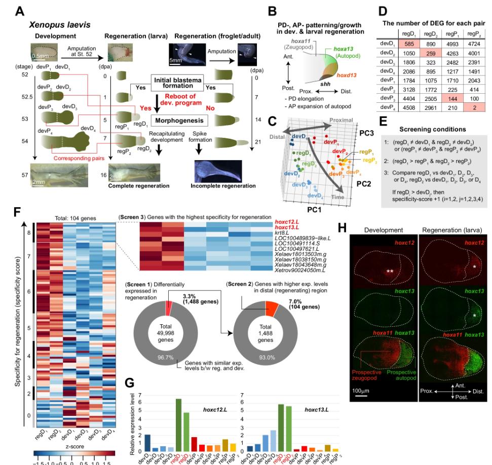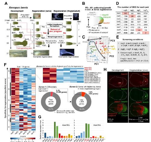 Fig. 1: Comparative transcriptomic analysis revealed that hoxc12 and hoxc13 expression show the highest regeneration specificity.A Xenopus limb development and regeneration. From an amputated larval limb bud, a complete limb regenerates, whereas from an amputated adult/froglet limb, an initial blastema is formed but subsequent morphogenesis is incomplete and terminates at spike formation. Red lines indicate the corresponding stage pairs between development and regeneration based on similarities in gene expression patterns shown in (D). B Axial patterning and growth observed in normal limb development and larval regeneration. Appropriate hox genes and morphogen expression are essential for normal morphogenesis including proximal-distal (P-D) elongation and anterior-posterior (A-P) autopod expansion. C Principal component analysis. D Number of genes with different expression levels for each pair of samples (FDR < 0.01). Since the number itself depends on the FDR-value as a threshold, the order of the numbers is of interest here. Pink shading indicates the development sample with the closest gene expression pattern to each regeneration sample. E Screening conditions for the three steps adopted. F The three screening steps for the detection of genes showing regeneration-specific expression changes. See the text and “Methods” section for details. The color in the leftmost panel shows the z-score for gene expression levels among the 6 samples. G Relative expression levels of hoxc12.L and hoxc13.L during Xenopus limb development and regeneration (the means of triplicate data). H Spatial patterns of hoxc12.L, c13.L, a13.L (an autopod marker), and a11.L (a zeugopod marker) expression within the limb bud during development and in the larval regenerating blastema. Both hoxc12 and hoxc13 are expressed in the prospective autopod region in the regenerating blastema (*), while during development, only hoxc12 shows clear expression restricted to the zeugopod (**). Each experiment was independently repeated three times for each gene with similar results. Source data are provided as a Source Data file. |