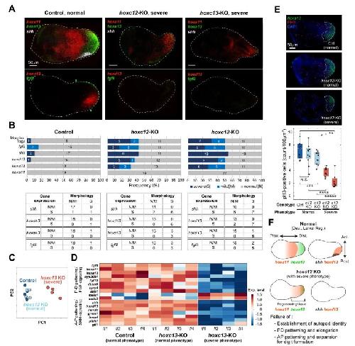 Fig. 3: Roles of hoxc12/c13 in reactivating patterning/growth during larval limb regeneration.A Typical spatial expression of patterning genes in the blastema of control (hoxc12+/+), hoxc12KO (hoxc12−/−), and hoxc13KO (hoxc13−/−) individuals at 4 dpa. B Statistics for the phenotypes in blastema morphology and gene expression for control (hoxc12+/+), hoxc12KO (hoxc12−/−), and hoxc13KO (hoxc13−/−) individuals. Biologically independent samples were used. N: normal; M: mild; S: severe. C Principal component analysis. D Comparative analysis of transcriptome data for typical patterning genes that function during limb development. E Effects of hoxc12/c13 knockout on cell proliferation in the prospective autopod region. Ctrl: hoxc12+/−. Box-plot elements: center line, median; box limits, upper and lower quartiles; whiskers, max/min. Statistical test (Student’s t-test, two-sided): *p = 2.44 × 10−5; **p = 2.43 × 10−6; ***p = 0.037; ****p = 2.81 × 10−4, *****p = 7.64 × 10−6. All data were obtained from biologically independent samples: n = 9 (Ctrl); n = 12 (c12KO, normal); n = 10 (c13KO, normal); n = 7 (c12KO, severe); n = 7 (c13KO, severe). F Summary of phenotypes. Source data are provided as a Source Data file. |