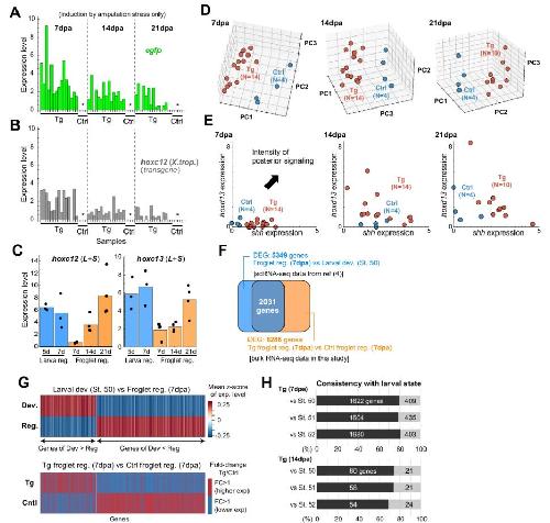 Fig. 5: The shift in gene expression profile of Tg-froglet blastema to that of the larval state.A, B Confirmation of the induction of transgene expression A egfp and B hoxc12 (X. tropicalis) solely through amputation stress. *: Not expressed in the control data. C Endogenous hoxc12/hoxc13 expression within the larval/froglet blastema during hindlimb regeneration. For larval regeneration (Xenopus laevis), triplicate data sets for regD1 and regD2 from Fig. 1 were used, and for froglet regeneration (Xenopus laevis), four control data sets shown in Fig. 5A/B (i.e., with no expression of egfp and hoxc12 transgenes) were utilized. Each experiment was independently repeated for larval/ froglet regeneration. Bar: mean. D Principal component analysis. E Comparison of Tg and control samples in the shh-hoxd13 expression space. F Extraction of differentially expressed genes (DEGs) between developing limb buds (St. 50) and froglet blastema (7 dpa) based on single-cell transcriptome data from Lin et al. (2021) (referred to as DEGbl-dev), and DEGs between Tg/control froglet blastema based on bulk-transcriptome data obtained in this study (referred to as DEGTg). G Comparison of expression levels for genes that are common in both DEGbl-dev and DEGTg; (top) developing limb bud vs froglet blastema and (bottom) Tg vs control froglet blastema (see “Methods” section for details). H Quantification of the consistency of the shift in gene expression profile in Tg animals toward the expression profile of a developing limb bud. Source data are provided as a Source Data file. |