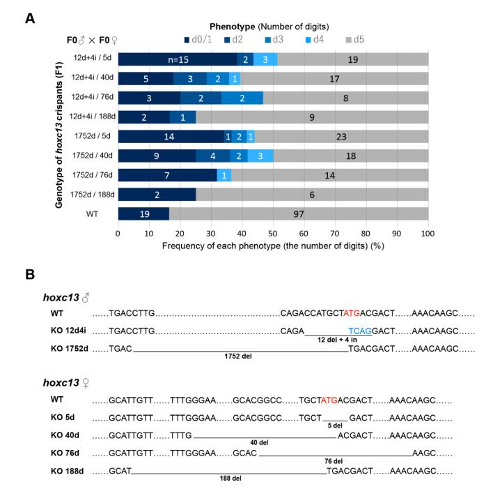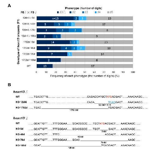 Fig. S7. Effects of hoxc13 knockout by genome editing in larval limb regeneration (A) Frequency distribution of phenotypes defined by the number of digits for individuals with deletions or insertions of different sub-sequences by genome editing. (B) Information about the deletion or insertion of sub-sequences for each parent. |