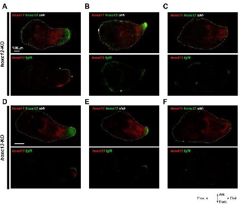 Fig. S8. RNAscope results for pattering genes (6 examples in addition to those shown in Fig.3a) (A, D) Mild morphological defects. hoxa11 and hoxa13 were exclusively expressed along the PD axis. shh expression was not detected. fgf8 expression was observed in the anterior half of the distal epithelium. The expression range of hoxd13 was smaller than during normal development (Fig. 3a). (B, E) Blastema growth was severely reduced. hoxa13 was expressed at the distalmost region, but no exclusive expression with hoxa11 was observed. shh, hoxd13 expression was almost undetectable. fgf8 expression was almost undetectable in (B) and was observed in the anterior half of the distal epithelium in (E). (C, F) Blastema growth was also severely reduced. Expression of genes other than hoxa11 was almost undetectable. |
