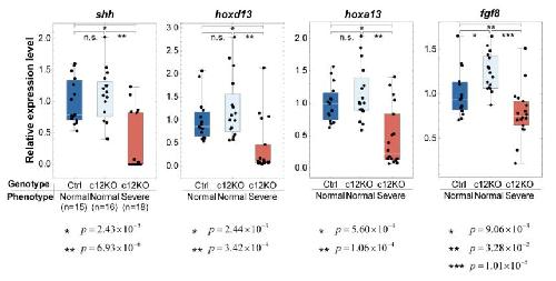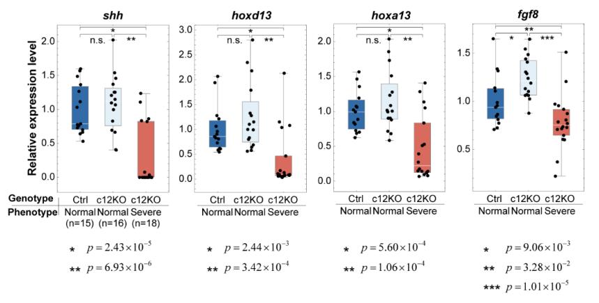 Fig. S9. Result of qPCR assay for some patterning genes. Comparisons were made among control (hoxc12+/-, with normal phenotype) and hoxc12-KO (with normal or severe phenotype). Box-plot elements: center line, median; box limits, upper and lower quartiles; whiskers, max/min. Statistical test (Student’s t-test, two-sided). Source data are provided as a Source Data file. |