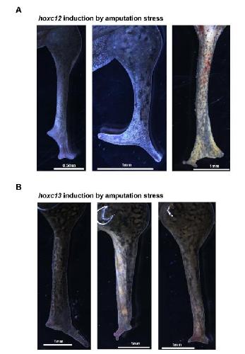 Fig. S11. Regenerated limbs with multifurcated distal cartilage Phenotypes generated by (A) hoxc12 or (B) hoxc13 induction by amputation stress (without heatshock). |