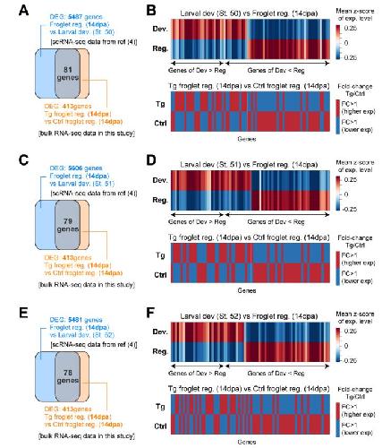 Fig. S16. Comparative transcriptome analysis. (A, C, E) Extraction of differentially expressed genes (DEGs) between developing limb buds (A: St. 50; C: St. 51, E: St. 52) and froglet blastema (14dpa) based on single cell transcriptome data from Lin et al (2021) (DEGbl-dev), and DEGs between hoxc12Tg/control froglet blastema (14dpa) based on bulk-transcriptome data obtained in this study (DEGTg). (B, D, F) Comparison of expression levels for genes that are common in both DEGbl-dev and DEGTg, which are identified in A, C, and E, respectively; (top) developing limb bud vs froglet blastema and (bottom) Tg vs control froglet blastema. Source data are provided as a Source Data file. |