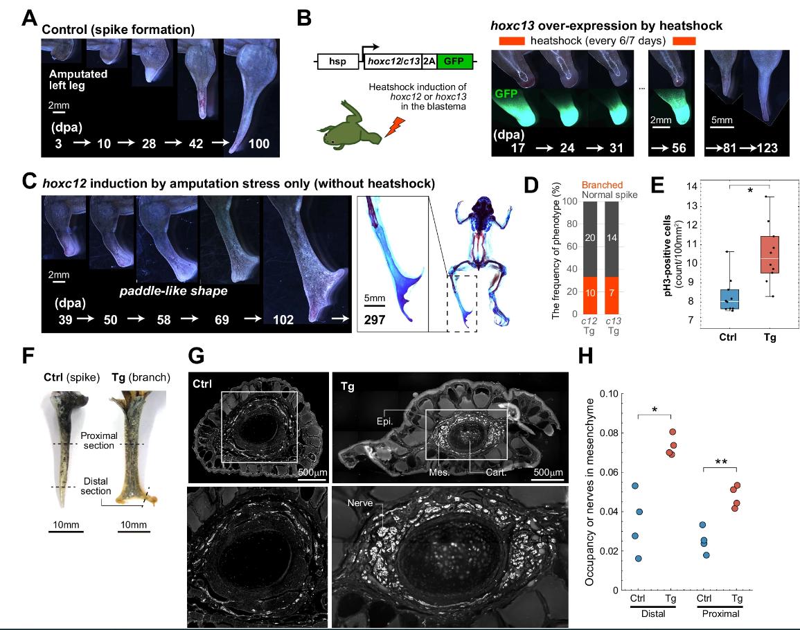 Fig. 4: The induction of hoxc12/c13 expression improves regenerative abilities after metamorphosis.A Morphological changes during spike formation from an amputated normal limb; dpa: days post-amputation. B Construct used to generate transgenic Xenopus laevis (left) and morphological changes in a blastema with hoxc13 over-expression by heat shock (right). C Morphological changes in a blastema under hoxc12 induction through amputation stress only (i.e., without heat shock; left). The shape of the blastema was paddle-like with branched distal tips, clearly different from that of normal spikes. Alcian blue/alizarin red staining of cartilage and bone (right). The branched distal cartilage tips had no clear segments and did not show bone differentiation. D The frequency of individuals showing branching of distal cartilage. E Effects of hoxc12 induction through amputation stress on cell proliferation in the blastema. Statistical test (Student’s t-test, two-sided): *p = 1.24 × 10−3. Box-plot elements: center line, median; box limits, upper and lower quartiles; whiskers, max/min. All data were obtained from biologically independent samples: n = 10 (Ctrl); n = 10 (Tg). F The positions of tissue sections where immunohistochemistry experiments were performed. G The distributions of regenerate nerves (stained with acetylated tubulin) within the mesenchyme (in the distal section in (F)). Right: hoxc12 transgenic X. laevis; left: control. The bottom panels are magnified views of the top panels. Epi: epithelium; Mes: mesenchyme; Cart: cartilage. H Quantification of regenerated nerves based on the occupancy ratio within the mesenchyme. Statistical test (Student’s t-test, two-sided): *p = 3.52 × 10−3; **p = 1.74 × 10−3. Source data are provided as a Source Data file. |