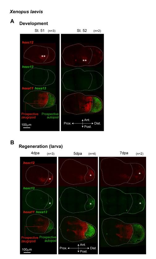 Fig. S3. hoxc12/c13 expression patterns during limb development and regeneration (A) hoxc12/c13 expression patterns in the developing limb buds at St. 51 and 52, and (B) in the larval regenerating limb blastema at 4, 5, and 7 dpa. Each experiment was independently repeated for each gene with similar results. |