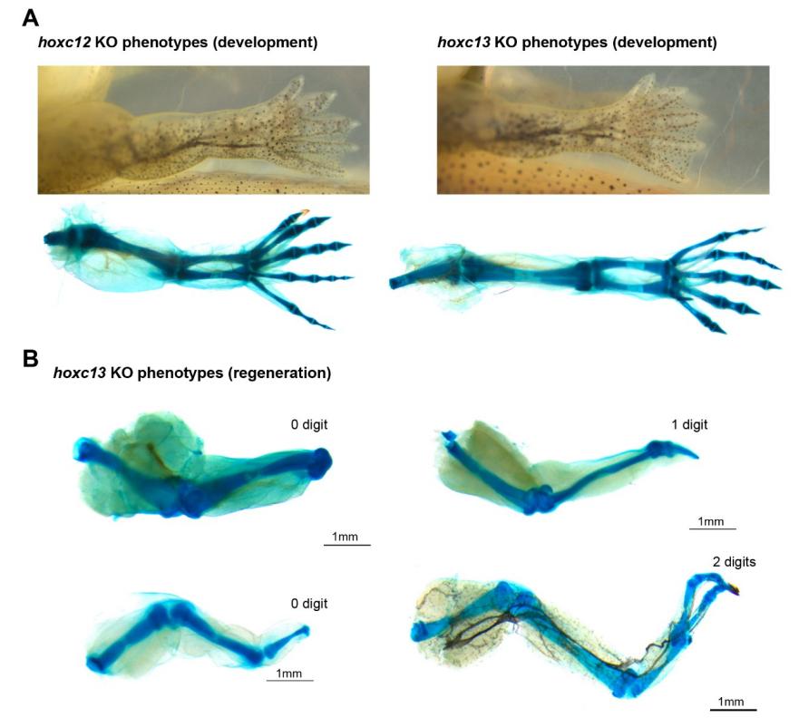 Fig. S4. Effects of hoxc12/c13 knockout on larval limb development and regeneration Examples of limb morphologies/cartilage patterns in development (A) and in regeneration (B). Cartilage was stained with Alcian blue. hoxc12-KO: hoxc12-/- ; hoxc13-KO: hoxc13-/- . |