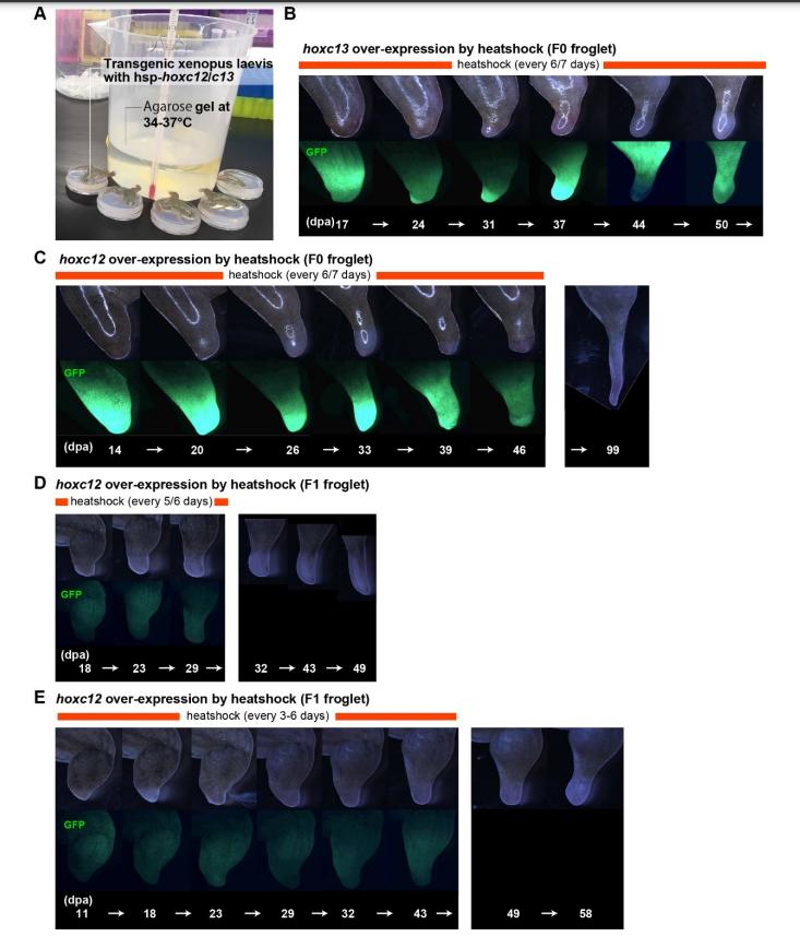 Fig. S10. Heat-shock induction of hoxc12 or c13 expression and phenotypes (A) Photo showing the experimental set up for the heat-shock induction of hoxc12 or hoxc13 expression by embedding amputated hindlimbs in agarose gel at 34-37°C (see Methods). (B-E) Morphological changes in blastema with hoxc12 or hoxc13 overexpression induced by heat-shock at varying durations (4 examples in addition to that shown in Fig. 4b). It should be noted that the induced GFP level by heat-shock in F1 individuals are weaker than that in F0, but still stronger than that by amputation stress only, for which microscopic detection was difficult. |