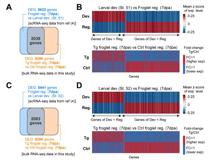 Fig. S15. Comparative transcriptome analysis. (A, C) Extraction of differentially expressed genes (DEGs) between developing limb buds (A: St. 51; C: St.52) and froglet blastema (7dpa) based on single cell transcriptome data from Lin et al (2021) (DEGbl-dev), and DEGs between hoxc12Tg/control froglet blastema (7dpa) based on bulk-transcriptome data obtained in this study (DEGTg). (B, D) Comparison of expression levels for genes that are common in both DEGbl-dev and DEGTg, which are identified in A and C, respectively; (top) developing limb bud vs froglet blastema and (bottom) Tg vs control froglet blastema. Source data are provided as a Source Data file. |