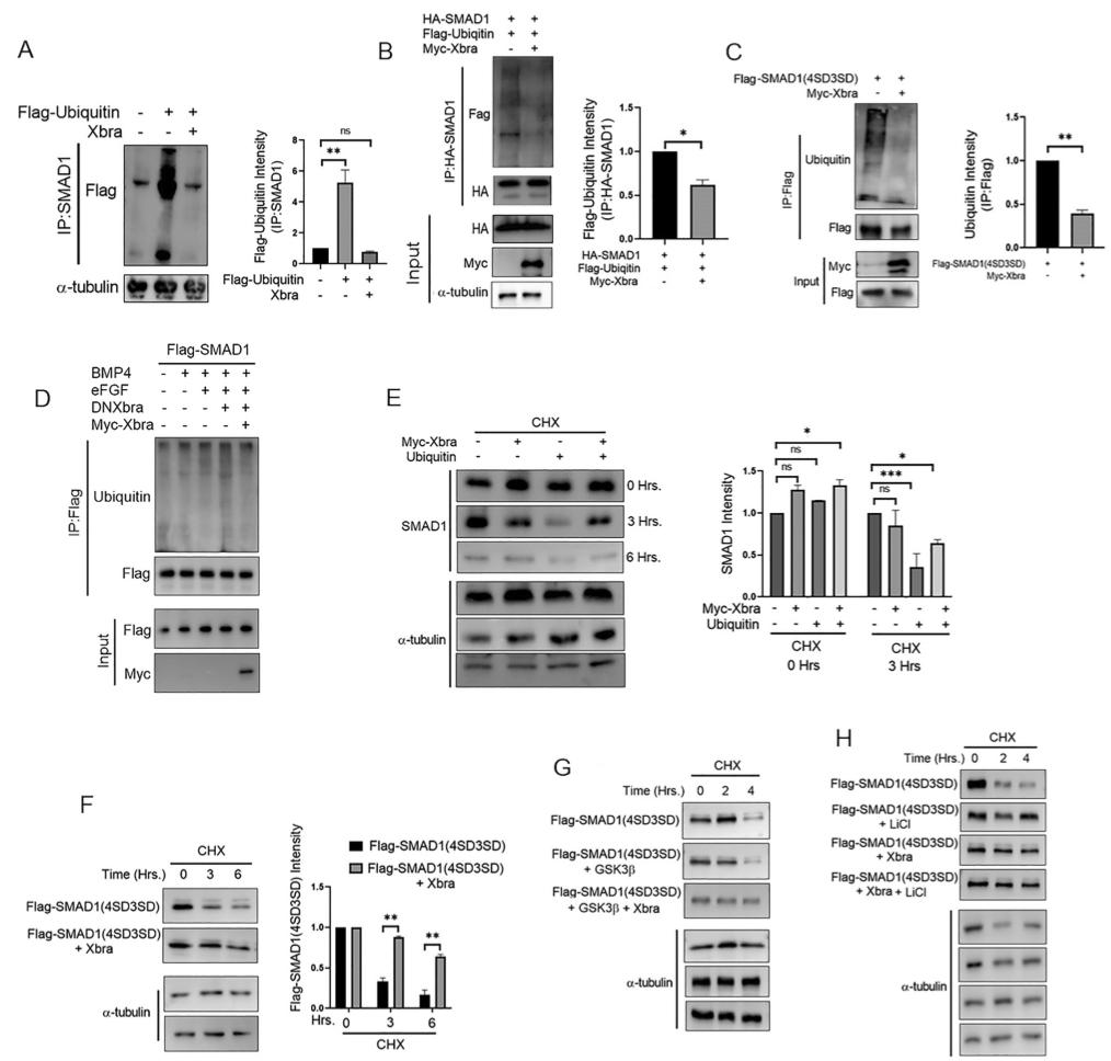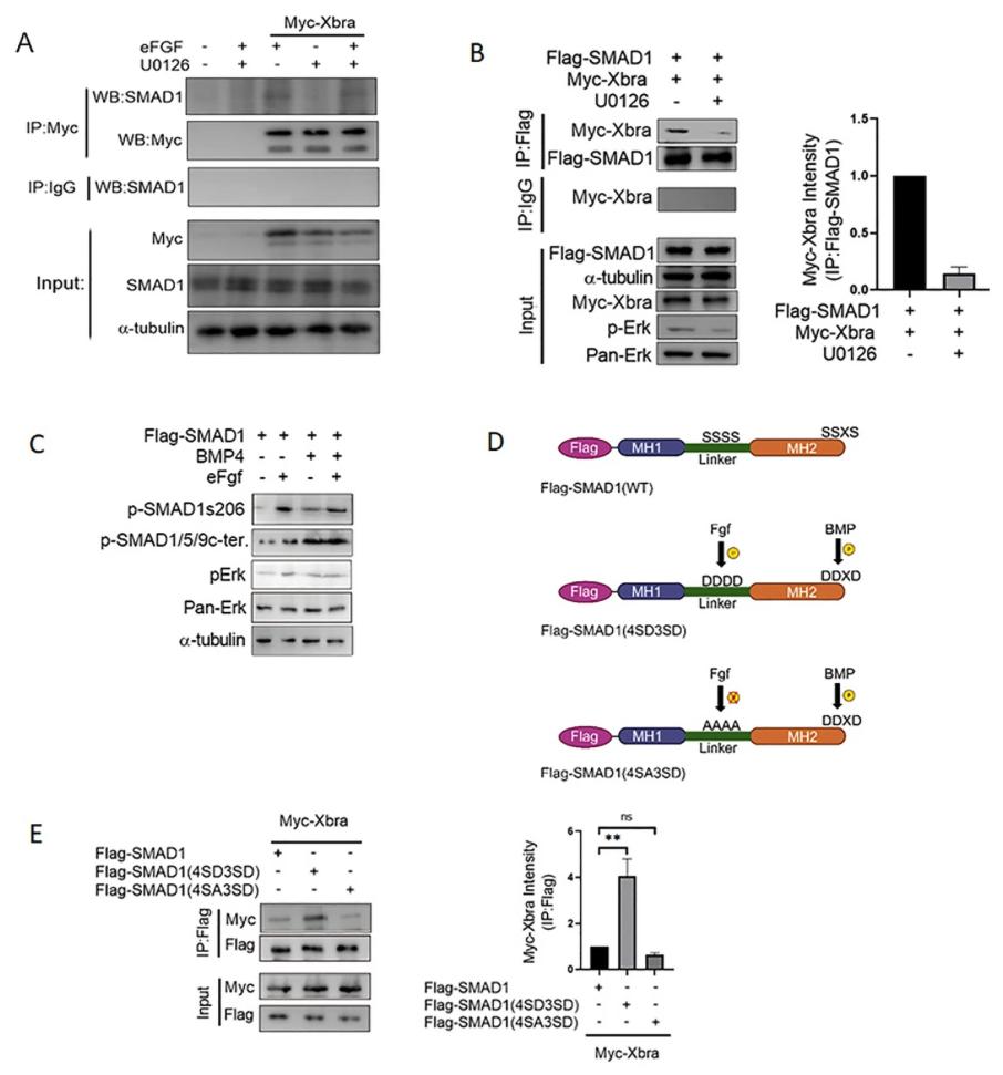 The Bmp/Smad1 pathway plays a crucial role in developmental processes and tissue homeostasis. Mitogen-activated protein kinase (Mapk)/Erk mediated phosphorylation of Smad1 in the linker region leads to Smad1 degradation, cytoplasmic retention and inhibition of Bmp/Smad1 signaling. While Fgf/Erk pathway has been documented to inhibit Bmp/Smad1 signaling, several studies also suggests the cooperative interaction between these two pathways in different context. However, the precise role and molecular pathway of this collaborative interaction remain obscure. Here, we identified Xbra induced by Fgf/Erk signaling as a factor in a protective mechanism for Smad1. Xbra physically interacted with the linker region phosphorylated Smad1 to make Xbra/Smad1/Smad4 trimeric complex, leading to Smad1 nuclear localization and protecting it from ubiquitin-mediated proteasomal degradation. This interaction of Xbra/Smad1/Smad4 led to sustained nuclear localization of Smad1 and the upregulation of lateral mesoderm genes, while concurrently suppression of neural and blood forming genes. Taken together, the results suggests Xbra-dependent cooperative interplays between Fgf/Erk and Bmp/Smad1 signaling during lateral mesoderm specification in Xenopus embryos.