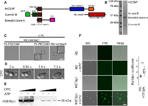 Figure 1. Recombinant CPC undergoes liquid–liquid phase separation. A, scheme of the CPC; BIR: baculovirus IAP repeat (dark green); SAH: single α-helix domain (blue); IN-Box: INCENP conserved box (red); DD—dimerization domain (magenta); triple helical bundle composed of the N terminus of Borealin and INCENP and the C terminus of Survivin (brown); Aurora kinase B domain (dark red). B, Coomassie-stained SDS-PAGE of purified recombinant CPC. C, differential interference contrast (DIC) of CPC condensates; scale bar represents 5 μm. Insets showed magnified views of dotted regions; scale bar represents 1 μm. D, DIC images demonstrating fusion of CPC coacervates; scale bar represents 1 μm. E, phase-separated CPC contains active kinase as measured by H3S10ph immunoblot after incubation with histone H3 Ser10 and ATP in the presence of 0.25, 0.5, and 1 μM LLPS CPC. F, phase-separated CPC retains the ability to specifically bind H3T3ph peptides. DIC and fluorescence images showing partitioning of histone H3T3ph (1–21)-FITC and H3T3 (1–21)-FITC into CPC condensates. Plot to the right shows calculated partition coefficient of H3T3ph (1–21)-FITC peptide (n = 42) and H3T3 (1–21)-FITC peptide (n = 42) into coacervates. Experiment was repeated twice; p = 2.2 × 10−16; scale bar represents 5 μm. Statistical analysis was performed by applying Kolmogorov–Smirnov test, ∗p < 0.05, ∗∗p < 0.01, ∗∗∗p < 0.001. Box and whisker graph represents the median (central line), 25th to 75th percentile (bounds of the box), and 5th to 95th percentile (whiskers). DIC, differential interference contrast; LLPS, liquid–liquid phase separation. |