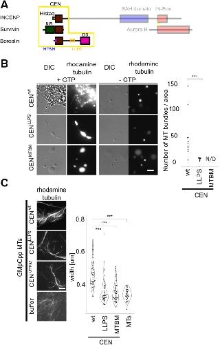 Figure 5. Phase separation propensity and MT binding of Borealin subunit of the CPC are important for MT nucleation and bundling. A, scheme of the CPC; CEN: centromere-targeting domain composed of full-length Survivin and Borealin, N-terminal fragment of INCENP. Mutations introduced to Borealin amino acid sequence are presented as blue (MTBM) and orange (LLPS) lines. The regions of the CPC that are not part of the CEN domain are faded out. B, DIC and fluorescence images of rhodamine-labeled MTs generated by CEN-Borealinwt, CEN-BorealinLLPS, and CEN-BorealinMTBM. Experiment was repeated three times. Plot shows the number of MT bundles per μm2; total number of MT bundles for CEN-Borealinwt (n = 612), for CEN-BorealinLLPS (n = 61); pwt-LLPS = 5.5 × 10−5, CEN-BorealinMTBM—not detected (N/D); scale bar represents 5 μm. C, GMpCpp-stabilized rhodamine-labeled MT bundled by CEN-Borealinwt, CEN-BorealinLLPS, and CEN-BorealinMTBM imaged in TIRF mode with excitation at 555 nm (rhodamine tubulin). Plot shows quantification of the width of single bundles of MTs. Experiment was repeated twice; CEN-Borealinwt (n = 49), CEN-BorealinLLPS (n = 43), CEN-BorealinMTBM (n = 49), MTs (n = 39); pwt-LLPS = 1.05 × 10−9; pwt-MTBM = 1.68 ×10−9. Statistical analysis was performed by applying Kolmogorov–Smirnov test; ∗p < 0.05, ∗∗p < 0.01, ∗∗∗p < 0.001; scale bar represents 5 μm. CPC, chromosomal passenger complex; DIC, differential interference contrast; LLPS, liquid–liquid phase separation; MT, microtubule; TIRF, total internal reflection fluorescence. |