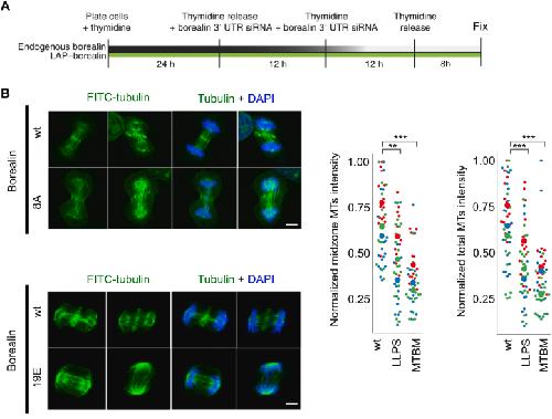 Figure 6. CPC phase separation and MT bundling are important for formation of bundled structures on the anaphase spindle. A, experimental design to visualize spindles in the first mitosis after knockdown and replacement of Borealin by siRNA in HeLa cells. B, fluorescence images of HeLa cells with endogenous Borealin replaced with WT or indicated Borealin mutants and stained for α-tubulin and DAPI. Maximum intensity projections of representative images are shown; scale bar represents 5 μm. Experiment was repeated three times, and the different colors in the quantifications represent experimental replicates; data were normalized between experimental replicates by dividing the mean values of intensity of signal from MTs by the maximum of the total intensity within each experimental replicate; CEN-Borealinwt (n = 28, 38, 32); CEN-BorealinLLPS (n = 26, 28, 42); and CEN-BorealinMTBM (n = 26, 30, 38). pwt-LLPS = (0.015, 0.00022, 0.0058); pMTBM = (1.77× 10−6, 6.9 × 10−5, 3.3 × 10−8). For statistical analysis, Welch's t test with Bonferroni correction was applied; ∗p < 0.05, ∗∗p < 0.01, ∗∗∗p < 0.001. CPC, chromosomal passenger complex; DAPI, 4′,6-diamidino-2-phenylindole; MT, microtubule. |