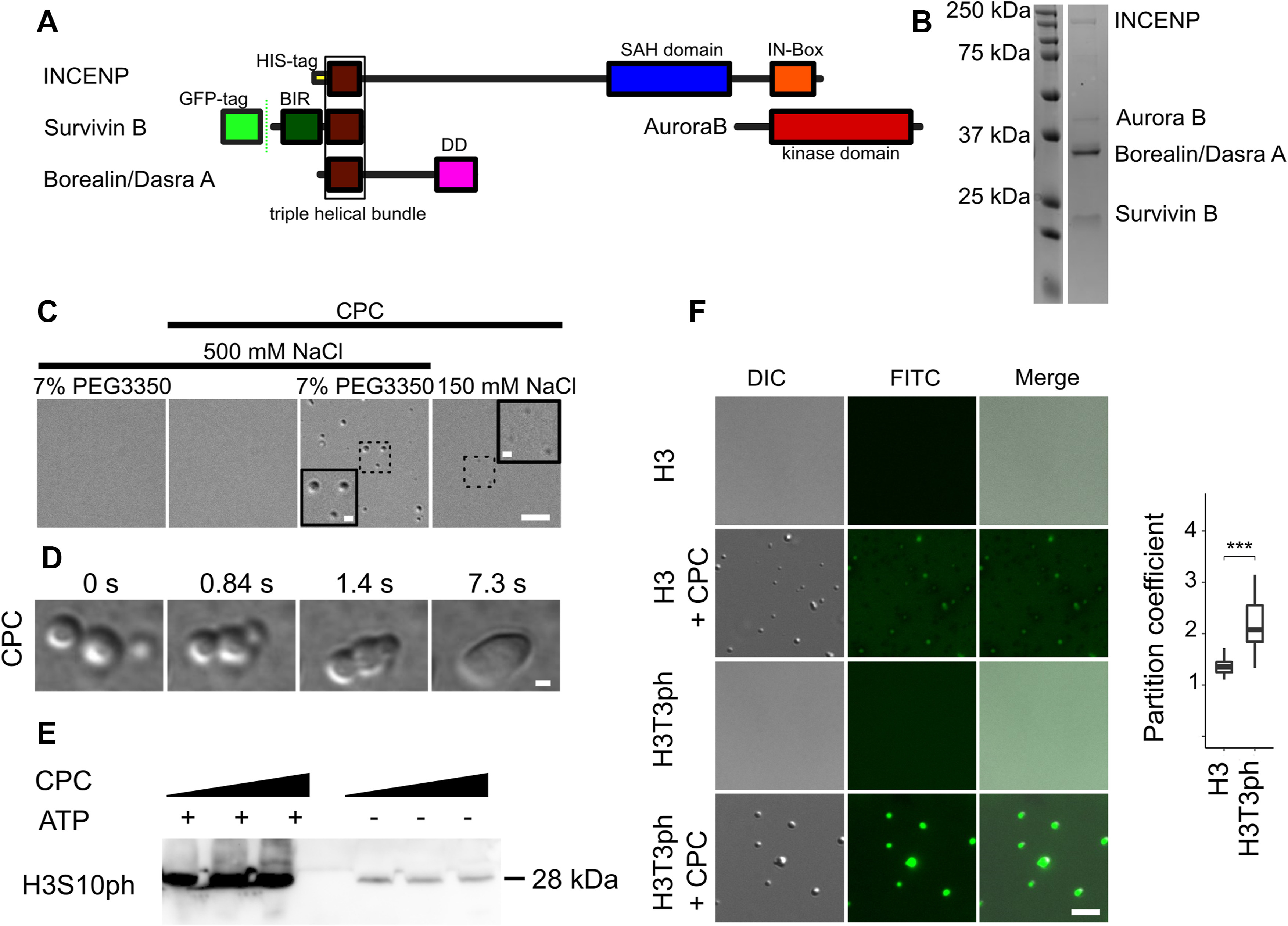 Figure 1. Recombinant CPC undergoes liquid–liquid phase separation.A, scheme of the CPC; BIR: baculovirus IAP repeat (dark green); SAH: single α-helix domain (blue); IN-Box: INCENP conserved box (red); DD—dimerization domain (magenta); triple helical bundle composed of the N terminus of Borealin and INCENP and the C terminus of Survivin (brown); Aurora kinase B domain (dark red). B, Coomassie-stained SDS-PAGE of purified recombinant CPC. C, differential interference contrast (DIC) of CPC condensates; scale bar represents 5 μm. Insets showed magnified views of dotted regions; scale bar represents 1 μm. D, DIC images demonstrating fusion of CPC coacervates; scale bar represents 1 μm. E, phase-separated CPC contains active kinase as measured by H3S10ph immunoblot after incubation with histone H3 Ser10 and ATP in the presence of 0.25, 0.5, and 1 μM LLPS CPC. F, phase-separated CPC retains the ability to specifically bind H3T3ph peptides. DIC and fluorescence images showing partitioning of histone H3T3ph (1–21)-FITC and H3T3 (1–21)-FITC into CPC condensates. Plot to the right shows calculated partition coefficient of H3T3ph (1–21)-FITC peptide (n = 42) and H3T3 (1–21)-FITC peptide (n = 42) into coacervates. Experiment was repeated twice; p = 2.2 × 10−16; scale bar represents 5 μm. Statistical analysis was performed by applying Kolmogorov–Smirnov test, ∗p < 0.05, ∗∗p < 0.01, ∗∗∗p < 0.001. Box and whisker graph represents the median (central line), 25th to 75th percentile (bounds of the box), and 5th to 95th percentile (whiskers). DIC, differential interference contrast; LLPS, liquid–liquid phase separation. |