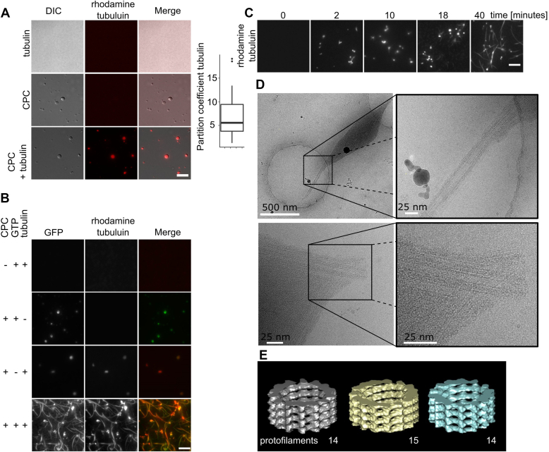 Figure 2. CPC coacervates generate bundles of MTs. A, CPC condensates concentrate free tubulin. DIC and fluorescence images of rhodamine-labeled tubulin dimers partitioning into CPC coacervates (n = 43). Experiment was repeated multiple times during the course of the project using different CPC preps (n = 3 preps). Box and whisker graph represents the median (central line), 25th to 75th percentile (bounds of the box), and 5th to 95th percentile (whiskers). B, CPC condensates generate tapered MT bundles in the presence of GTP. GFP-CPC was incubated with rhodamine-labeled tubulin and GTP as indicated. Experiment was repeated twice. C, bundles of MTs generated in the presence of phase-separated CPC imaged by TIRF microscopy after the indicated time. Experiment was repeated multiple times during the course of the project using three different CPC preps; scale bar for A, B, and C represents 5 μm. D, cryo-EM images of bundles of MTs generated by the CPC. E, 3D reconstruction of single MTs generated by the CPC. Cryo-EM measurements were done twice from two independent CPC preps. CPC, chromosomal passenger complex; DIC, differential interference contrast; MT, microtubule; TIRF, total internal reflection fluorescence. |