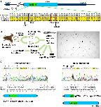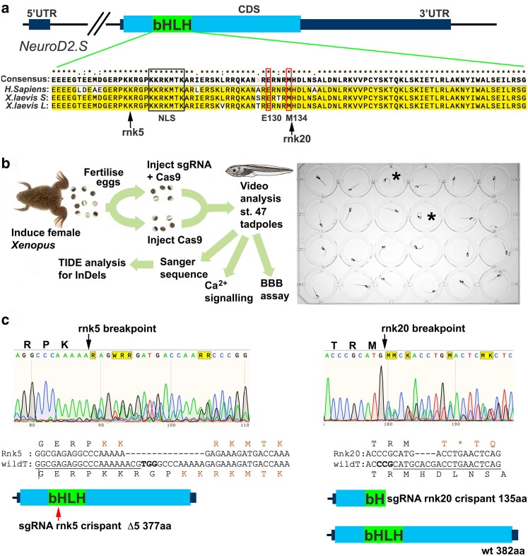 Fig. 1. CRISPR/Cas9 editing of NeuroD2 in tadpoles. a) Schematic of the X. laevis NeuroD2.S gene, the homeolog NeuroD2.L is the same for all key aspects shown, including sgRNA binding sites. The NeuroD2 transcription factor is encoded by a single exon (CDS) and the bHLH DNA binding domain is indicated. Alignment of the bHLH domain between H. sapiens and X. laevis shows a high degree of conservation at protein level. Nuclear localization sequence (NLS) is indicated by a black box, and the conserved positions of the previously described de novo human variants E130Q and M134T that cause DEE75 (Sega et al. 2019) indicated by thin red boxes. The approximate sites of Cas9 cleavage sites of the sgRNA used in this study are indicated by arrows. b) Schematic of the experimental process. C-SC are indicated in two tadpoles (black asterisk). c) Example Sanger sequence traces with Cas9 breakpoints for both sgRNA indicated by black arrows. The most common outcomes for each guide are shown as sequence and protein schematics: rnk5 deletes 15bp leading to a loss of 5 amino acids in the bHLH DNA binding domain, indicated by the red arrow. The NLS KKRKMTK is reformed around this deletion. Rnk20 sgRNA causes a 4bp deletion which results in a premature STOP codon (orange asterisk) and a truncated protein lacking much of the DNA binding domain is predicted.