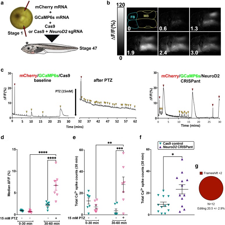 NeuroD2 CRISPant tadpoles show strong, prolongued, and widespread Ca2+ signals in the brain. a) Experimental design. Fertilized X. laevis embryos at the one cell stage were injected twice (red arrows) on either side of the female nucleus (light spot), avoiding the ventrally located sperm entry point (dark spot). mCherry mRNA was used to confirm injection, GCaMP6s mRNA encodes a Ca2+-sensing fusion protein that can detect action potentials, emitting strong fluorescence in the GFP channel signals (Li et al. 2022). Controls were only injected with Cas9 protein, and CRISPant embryos were injected with Cas9 with NeuroD2 sgRNA rnk20 loaded. Embryos were raised to stage 47. b) Example still frames taken every 0.64minutes from a live NeuroD2 CRISPant tadpole brain (TILLvisION 4.0). GCaMP6s fluorescence (lighter colour = higher intensity) can be seen across large regions of the brain. Scale bar indicates Ca2+ signal intensity (%). Forebrain (FB) hemispheres outlined in blue, midbrain (MB) in yellow, hindbrain in pink is mostly out of shot. Time in minutes is indicated in the bottom left. c) Examples of Ca2+ signals in the midbrain optic tectum (MFI across 30minutes), in control, PTZ-induced wild type tadpoles and NeuroD2 CRISPants. Note that the PTZ-induced Ca2+ signals are relative to baseline activity (before PTZ application). Red arrowheads indicate large spikes and gold arrowheads small spikes. (df) Scatterplots showing individual tadpoles as triangles, horizontal bars are means and error bars show SEM. d) Median midbrain Ca2 + signals in two groups of N = 7 Cas9 control tadpoles. One group was exposed to 15mM PTZ to induce seizure activity in the second recording time window (3060minutes). 2-way ANOVA, post hoc test of all means (uncorrected Fisher's LSD) ****P < 0.0001 e) Comparison of total (large and small) Ca2+ spikes in the same tadpoles and groups as in panel d, 2-way ANOVA, **P < 0.01, ***P < 0.001. f) Comparison of total Ca2+ spikes in Cas9 control tadpoles vs NeuroD2 CRISPants (N = 12) MannWhitney Test *P < 0.05). g) Summary of editing types detected by TIDE in the NeuroD2 CRISPant tadpoles used to generate these data. Trace data for all tadpoles in the study can be found in Supplementary Fig. 3 in Supplementary File 2, raw data and statistics in Supplementary File 1.