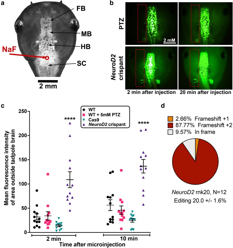 Fig. 4. NeuroD2 CRISPant tadpoles have a comparatively leaky BBB. a) Dorsal view of stage 47 tadpole head to show the parts of the brain and site of Na fluorescein (NaF) injection into the hindbrain ventricle (red circle and arrow). FB, forebrain; MB, midbrain; HB, hindbrain; SC, spinal cord. b) Examples of NaF dye injected tadpoles at 2 and 20minutes after injection, visualized with GFP2 channel. Orientation of the tadpole head as in (a). Dotted rectangles show the area outside the brain that was used to calculate MFI. Scale bar in top left applies to all panels. Top, wild type (WT) tadpole treated with 5mM of seizure-inducing drug PTZ for 2hours prior to dye injection. Bottom, untreated NeuroD2 CRISPant, sgRNA rnk20. c) Scatter plot showing MFI (dye leakage outside the brain) at 2 and 20minutes post NaF dye injection for N=12 tadpoles per group, 2-way ANOVA with Tukey post hoc analysis, ****P <0.0001. Cas9 indicates tadpoles injected with Cas9 protein, but no sgRNA. d) Summary of tadpole editing in the NeuroD2 CRISPant group, confirmed by Sanger sequencing and TIDE analysis. Raw data are in Supplementary File 1 and Supplementary Fig. 5 in Supplementary File 2.