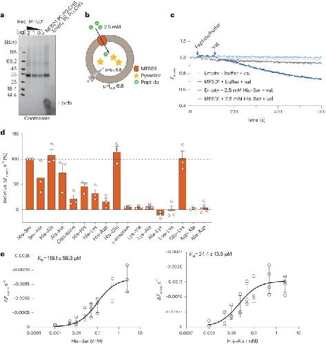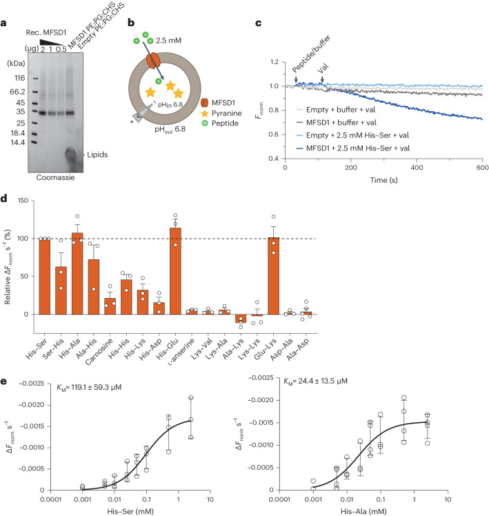 Fig. 3. MFSD1 is active as a dipeptide transporter in a liposome-based assay.a, Coomassie-stained SDS–PAGE gel of MFSD1 after reconstitution into POPE:POPG:CHS liposomes (PE:PG:CHS). The experiment was performed 11 times. Rec., recombinant. b, A schematic of the experimental setup of liposome-based transporter assay. c, Representative traces of time-course measurements of uptake in the presence of 2.5 mM His-Ser and 1 µM val using MFSD1-containing liposomes (mmMFSD1) and those devoid of protein (empty). The addition of peptide or buffer and val during the measurements is indicated by the arrows. d, Substrate specificity of MFSD1 measured for liposome-based uptake assays. The initial uptake rates for each peptide are given as a percentage of the determined initial uptake rate of His-Ser. The data are shown as mean ± s.d. for n = 3. e, Michaelis–Menten kinetics of uptake of His-Ser and His–Ala by MFSD1. The KM and vmax values were calculated from three independent experiments using Prism GraphPad. The individual data points are plotted as mean ± s.d. The source numerical data are available in the source data.Source data |
