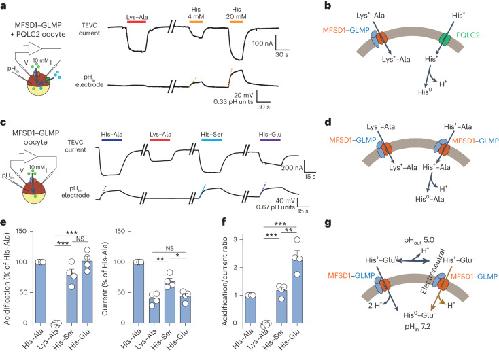 Fig. 4. MFSD1 is a dipeptide uniporter.a, Combined TEVC and pHin recording of oocytes expressing both MFSD1–GLMP and PQLC2 (sorting mutant L290A/L291A) at their surface. His, but not Lys–Ala, applied at pH 5.0, induces intracellular acidification (orange dotted lines). The traces are representative of five oocytes shown in Extended Data Fig. 3b. b, A model for the acidification induced by His following its release from PQLC2. c, Combined TEVC and pHin recording of an MFSD1–GLMP oocyte perfused with the indicated dipeptides (10 mM) at pH 5.0. d, A model accounting for the selective acidification by His-containing dipeptides. e, The experiment in c was repeated on four MFSD1–GLMP oocytes. The data are means ± s.e.m. of the acidification and current responses normalized to His–Ala (two-tailed unpaired t-test). *P ≤ 0.05, **P ≤ 0.01 and ***P ≤ 0.001. f, Normalized acidification/current ratios provide the number of protons released per translocated elementary charge for each substrate (two-tailed unpaired t-test). Mean ± s.e.m. **P ≤ 0.01 and ***P ≤ 0.001. g, A model accounting for the high number of protons released by His–Glu. At the tested potential (−40 mV), His–Glu molecules would be taken up by MFSD1–GLMP predominantly in the minor cationic form, His+–Glu0, releasing two protons per elementary charge. The higher acidification/current ratio observed (2.5 ± 0.2) may result either from the non-linear acidification/current relationship (Main) or from simultaneous uptake in the predominant zwitterionic form, His+–Glu-, which would release another proton in an electroneutral manner. The source numerical data are available in the source data.Source data |
