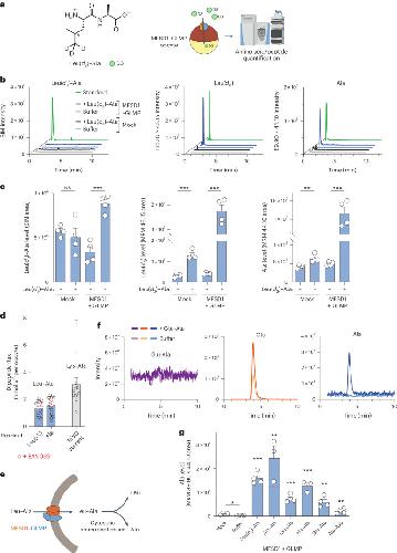 Fig. 5. MFSD1 has a broad dipeptide selectivity.a, Heavy isotope tracer approach used to monitor Leu–Ala transport. b, Representative LC–MS chromatograms of ≥5 independent experiments. The amount of standard (green lines) was 3.9 pmol for Leu(d3)–Ala and 15.6 pmol for Leu(d3) and Ala. c, Relative quantification of the chromatographic peak area of Leu(d3)–Ala, Leu(d3) and Ala in extracts from mock and MFSD1–GLMP oocytes, incubated or not, with, 10 mM Leu(d3)–Ala for 20 min at pH 5.0. The data are means ± s.e.m. of four oocytes from a representative example of three independent experiments (two-tailed unpaired t-tests). *P ≤ 0.05, **P ≤ 0.01 and ***P ≤ 0.001. d, Absolute quantification of Leu–Ala uptake. The data are means ± s.e.m. of 17 oocytes from two oocyte batches. In one experiment, some oocytes were treated with the branched-chained amino acid transaminase inhibitor BAY-069. The Lys–Ala currents from Fig. 2c were divided by the Faraday constant and plotted with the same scale (grey bar) to allow comparison with Leu–Ala uptake. e, A model accounting for the LC–MS/MS data. f, Representative LC–MS chromatograms of eight MFSD1–GLMP oocytes from two batches incubated for 23 min at pH 5.0 with 10 mM Glu–Ala. g, Quantification of Ala in oocytes incubated for 23 min with the indicated dipeptides (10 mM). The means ± s.e.m. of three to four oocytes are depticted. The red dotted line at mid-height of the Ala–Ala bar is shown for comparison with other substrates. Two-tailed unpaired t-tests relative to MFSD1–GLMP oocytes incubated in dipeptide-free buffer; *P ≤ 0.05, **P ≤ 0.01 and ***P ≤ 0.001. The source numerical data are available in the source data. |