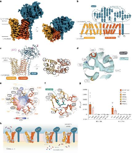 Fig. 6. The outward-open structure of GLMP–MFSD1.a, Cryo-EM map of GLMP–MFSD1His–Ala. The N- and C-domain of MFSD1 are coloured yellow and orange, respectively. GLMP is coloured blue. b, Topology diagram of MFSD1 and GLMP. The N- and C-termini are labelled, and the secondary structure elements are numbered. c, Cartoon representation of GLMP–MFSD1 with top view of MFSD1. The numbering of TMs is indicated. Sugar modifications (acetylglucosamine (NAG)) identified on GLMP are coloured pink. d, Additional binding-site density was found for the GLMP–MFSD1 data set in the presence of the dipeptide with His–Ala (MFSD1His–Ala) compared with the apo dataset (MFSD1apo). The map of MFSD1His–Ala is shown as light blue surface and that of the apo dataset as grey mesh (light grey). Both the maps are depicted at σ = 6. The residues surrounding the extra density are labelled. e, The electrostatic surface potential (expressed as kT/e, with k, Boltzmann constant; T, temperature in K; and e, elementary charge), calculated with the APBS plugin in PyMol, highlights the bipolar character of the binding site. The residues that were mutated in this study are framed in bold black. f, Binding of the protonated dipeptide His+–Ala (green) as observed after 500 ns of MD simulations. Hydrogen bonds are indicated as dashed black lines, and residues used for mutational studies are framed in bold black. g, Effect of mutations of binding-site residues on uptake of His–Ala or His-Ser compared with MFSD1WT. The uptake rates are given as mean ± s.d. for n = 8 (MFSD1WT) or n = 4 (mutants) of independent experiments. h, A schematic of transport of dipeptides (blue (N-terminus) and red (C-terminus) sticks) by the GLMP–MFSD1 complex. The cytoplasmic gate formed by residues N157, F173, W373 and Y369 is shown (shown as a grey bar) as well as residues E150 and R118 involved in peptide coordination. The source numerical data are available in the source data. |