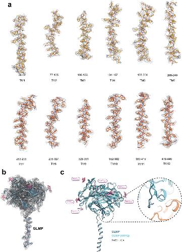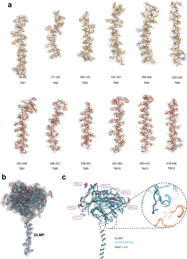 Extended Data Fig. 7. Density map of the Cryo-EM structure of GLMP-MFSD1His-Ala.(a) Cyro-EM map (grey mesh) is shown and depicts a density within a 2.5 Å radius of any modelled atom. Maps are shown for individual helices of MFSD1, with individual residues shown as sticks (yellow and orange). (b) Cryo-EM map (grey mesh) is shown and depicts a density within a 2.5 Å radius around the model of GLMP (blue). Individual residues of the transmembrane helix and the five NAG molecules (pink) are shown as sticks. (c) Overlay of the Cryo-EM structure of GLMP (blue) with the X-ray structure of GLMP (light blue, PDB-ID: 6NYQ). The RMSDCα of the superimposition is 1.12 Å over 271 residues of the luminal GLMP domain. Five of the NAG molecules (pink) identified in the Cryo-EM structure overlap with the six NAG molecules (light pink) found in the X-ray structure of GLMP (PDB-ID: 6NYQ). Additionally, the X-ray structure of GLMP contains three sodium ions (purple spheres). The zoom-in highlights the loop region, which is responsible for the interaction of GLMP with MFSD1, which has not been modeled in the crystal structure and is structured in the EM-derived model. |