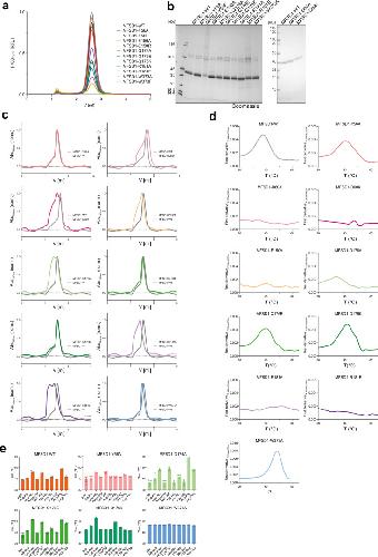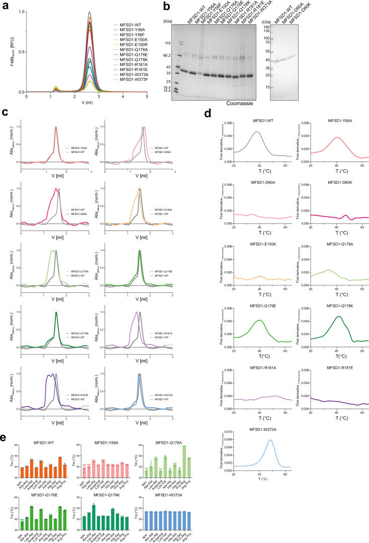 Extended Data Fig. 10. The binding-site mutations in MFSD1 lose binding to peptides in the thermal stability assay.(a) FSEC analysis of MFSD1WT and mutants normalized to the fluorescent signal at λex = 488 nm/λem = 510 nm of GFP (F488) of MFSD1WT. The supernatant of soluble fraction after whole-cell solubilization was loaded onto a Superose 6 5/150 column. (b) SDS-PAGE of purified MFSD1WT and binding site mutants. For each lane, 2 µg of protein were loaded. (c) Comparison of SEC traces of binding site mutants (colored) to MFSD1WT (grey) of each mutant. Each mutant was purified once for subsequent experiments. (d), (e) Melting temperatures derived from thermal stability experiments of each mutant in the absence (apo, grey) or presence of 5 mM of selected peptides. n = 3 independent experiments with data shown as mean ± SD. For mutants for which no bar graph is given, unfolding traces are given for the apo state to show that no TM value could be determined. Source numerical data and unprocessed blots are available in source data.