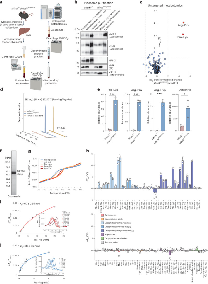 Fig. 1. Mfsd1-knockout mice accumulate cationic dipeptides in liver lysosomes, and recombinant MFSD1 binds various dipeptides.a, A schematic representation of lysosome enrichment by ultracentrifugation and untargeted metabolomics. b, Immunoblot analysis of PNS, mitochondria and lysosome-enriched fractions and the final lysosome-enriched fraction from WT and Mfsd1-knockout mice for markers of various cellular compartments. ER, endoplasmic reticulum. c, Volcano plot of differential metabolites between liver lysosomes of WT and Mfsd1-knockout mice (two-sided one-way analysis of variance with Tukey’s post hoc test, adjustment for multiple testing). d, Extracted ion chromatogram (EIC) for the chemical standard Pro–Arg (yellow, 100 nM) and representative samples from WT (red) and Mfsd1-knockout mice (blue). Pro–Arg is detected as a peak eluting at a retention time (RT) of 8.44 min. e, Relative abundance of Pro–Lys, Arg–Pro and anserine between WT and Mfsd1-knockout mice. The abundance was normalized to the isotopically labelled arginine levels, which showed no differences between the two genotypes in the untargeted metabolomic analysis (two-tailed unpaired t-tests). The data are means ± s.e.m. N = 5 for the animals/genotype (*P ≤ 0.05 and ***P ≤ 0.001). f, Coomassie-stained SDS–PAGE gel of purified MFSD1 with a Twin-Strep-tag that was transiently expressed in Expi293F cells and purified to homogeneity in DDM/CHS detergent solution. g, Unfolding traces of MFSD1 in the absence and presence of Ala–Ala, Pro–Arg, Leu–Ala and Lys–Val at a concentration of 5 mM. h, Thermal stability of MFSD1 in the presence of a compound library at a 5 mM final ligand concentration. The ΔTm of MFSD1 are given as a difference to the melting temperature of apo MFSD1 (Tm(apo)). The data are means ± s.e.m. (n = 3 for the independent samples). i,j, Examples of KD measurements are based on changes in the thermal stability of MFSD1 in the presence of varying concentrations of the dipeptides His–Ala (red) (i) or Pro–Arg (blue) (j). The KD values were determined using Moltenprot67. h–j, Data are shown as mean ± s.d. The source numerical data and unprocessed blots are available in the source data.Source data |