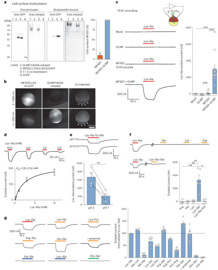 Fig. 2. Cationic dipeptides evoke an inward current in MFSD1–GLMP-expressing oocytes.a, Surface biotinylation analysis of Xenopus oocytes expressing MFSD1L11A/L12A-EmGFP and/or GLMPY400A-mKate2. The oocytes expressing EGFP in the cytosol validated the selectivity of surface labelling in streptavidin-bound fractions. The western blots are representative of three independent experiments. b, Fluorescence micrographs of representative oocytes (n = 7 for either GLMP or MDFS1 alone and n = 25 for MFSD1 + GLMP). The arrowheads show MFSD1–GLMP colocalization at the plasma membrane. c, TEVC recording of oocytes clamped at −40 mV and perfused with 10 mM Lys–Ala at pH 5.0. The traces show representative Lys–Ala-evoked currents of 7–14 oocytes per expression condition. Only 2 out of 14 oocytes expressing only MFSD1L11A/L12A-EmGFP responded to Lys–Ala. The P values were calculated using two-sided Mann–Whitney U tests (***P ≤ 0.001). d, Dose–response relationship of the Lys–Ala current in MFSD1–GLMP oocytes. The current follows Michaelis–Menten kinetics with a KM of 2.6 ± 0.4 mM (mean ± s.e.m. of n = 3 oocytes). e, Lys–Ala was applied to each MFSD1–GLMP oocyte at pH 5.0 and pH 7.0 (mean ± s.e.m. of n = 4 oocytes). Two-tailed paired t-test, **P ≤ 0.01. f, Response of MFSD1–GLMP oocytes to cationic amino acids and to the tripeptide Lys–Ala–Ala (10 mM each) at pH 5.0. The P values were calculated using two-sided Mann–Whitney U tests, *P ≤ 0.05 and **P ≤ 0.01 (mean ± s.e.m. of n = 5 oocytes (Arg, His, Lys and Lys–Ala) and n = 4 oocytes (Lys–Ala–Ala)). g, Response of MFSD1–GLMP oocytes to diverse dipeptides compared with Lys–Ala (mean ± s.e.m. of 4–11 oocytes per substrate). The source numerical data and unprocessed blots are available in the source data. |
