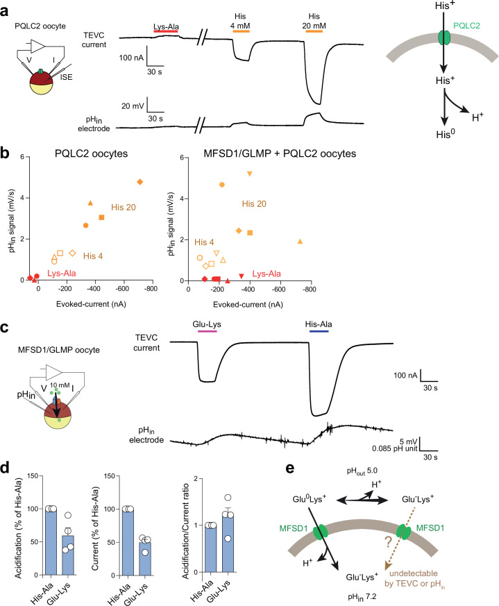 Extended Data Fig. 3. Additional evidence for the uniporter model uptake of Glu-Lys into MFSD1/GLMP oocytes.(a) Combined TEVC and intracellular pH (pHin) recording of oocytes expressing only the sorting mutant of PQLC2. Lys-Ala (20 mM) is not transported by PQLC2. The traces are representative of four PQLC2 oocytes. (b) The current/acidification relationship of the experiments is shown in Fig. 4a and Extended Data Fig. 3a. The graphs show individual TEVC and pHin responses to Lys-Ala (10 mM) and His (4 or 20 mM). Each symbol shape represents a distinct oocyte. (c) Representative TEVC and pHin traces of the response of MFSD1/GLMP oocytes to Lys-Glu. (d) Acidification and current responses normalized to His-Ala and normalized acidification/current ratios. Data are means ± SEM of 4 oocytes. (e) A model accounting for the uptake of Glu-Lys by MFSD1/GLMP. Only uptake of the minor cationic form, Glu0-Lys+, can be detected in this electrophysiological technique. Source numerical data are available in source data. |