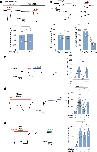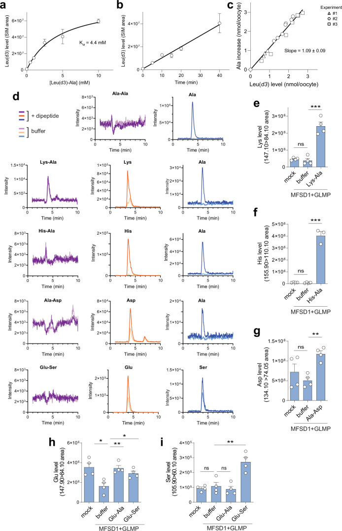 Extended Data Fig. 4. Additional evidence for Leu-Ala uptake by MFSD1 and Substrate selectivity of MFSD1/GLMP in the LC-MS/MS assay.(a) Dose-response relationship of the accumulation of Leu(d3) in MFSD1/GLMP oocytes exposed to Leu(d3)-Ala (means ± SEM of 3 oocytes). The line shows a hyperbolic curve fit with a KM value of 4.4 mM (R2 = 0.989). (b) Time course of Leu(d3) accumulation in the presence of 10 mM Leu(d3)-Ala (means ± SEM of 3 oocytes). Linear regression R2 = 0.980. (c) Relationship between the accumulation of Leu(d3) and the increase of ‘light’ Ala over its endogenous level. Data shown in Fig. 5c were replotted to show the equimolar ratio between these two proxies of Leu(d3)-Ala uptake. Linear regression of the pooled data yielded a ratio of 1.15 Ala molecule co-released with each Leu(d3) molecule (R2 = 0.980), or a mean ratio of 1.09 ± 0.09 when the 3 experiments were analyzed separately. (d-i) Substrate selectivity of MFSD1/GLMP in the LC-MS/MS assay. (d) Representative LC-MS chromatograms of 6 to 8 oocytes per condition from 2 independent experiments. (e-i) Relative quantification of the chromatographic peak area of Lys, His, Asp, Glu, and Ser in extracts from mock and MFSD1/GLMP oocytes, incubated or not, with the indicated dipeptides (10 mM) for 23 min at pH 5.0. Data are means ± SEM; (e + g): n = 4 oocytes, (f): n = 3 oocytes from the same experiment. Two-tailed unpaired t-tests: ns = not significant; * p ≤ 0.05; ** ≤ 0.01; *** p ≤ 0.001. Source numerical data are available in source data. |