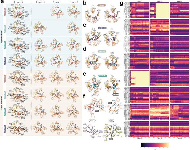 Extended Data Fig. 8. MD simulations of dipeptide-bound MFSD1 and Flexibility of dipeptide binding in MFSD1 during MD simulations.(a) MD simulations were performed on MFSD1 in complex with the dipeptides Leu-Ala (rose), His-Ala in its neutral (His(0)-Ala, pale teal) and charged (His(+)-Ala, teal) state and Lys(+)-Ala, purple). The basis of the binding mode for each peptide was the initial non-protein density found in the GLMP-MFSD1His-Ala map. The dipeptide His-Ala was placed in two different binding poses, denoted peptide orientation 1 (pale blue background) and peptide orientation 2 (light orange background). Based on this pose, the remaining ligands were oriented. Shown and labeled are critical binding site residues for each starting structure and the same view for the binding site of each simulation run after 500 ns. Additional interacting residues appearing at the endpoint of the simulation are highlighted in the respective panels. (b-g) Flexibility of dipeptide binding in MFSD1 during MD simulations. (b) The binding site of MFSD1 represents the starting pose of Leu-Ala (grey) and the final pose of the peptide after 500 ns of MD simulation (light purple) for each of the two peptide orientations (1 and 2). Below are RMSD plots of distant changes of the N- and C-terminus of the peptide with respect to residues E150 and R181. Plots show the results for each peptide orientation (orientation 1-blue, orientation 2-orange). MD simulations were run in triplicates. (c) Illustration of the MFSD1 binding site of MFSD1 with the starting pose of Lys-Ala pose of the dipeptide His(0)-Ala (grey) and the final pose after 500 ns of triplicate MD simulation (pale teal) for each of the two peptide orientations (1&2). (d) Binding site of MFSD1 showing the starting pose of the dipeptide His(0)-Ala (grey) and the final pose after 500 ns of MD simulation (pale teal) for each of the two peptide orientations (1&2). Below are RMSD plots of distant changes of the N- and C-terminus of the substrate with respect to residues E150 and R181. RMSD plots highlight the results for each peptide orientation (orientation 1-blue, orientation 2-orange) run in triplicates. (e) The Starting pose of the dipeptide His(+)-Ala (grey) and the final pose in the MFSD1 binding site after 500 ns of MD simulation (dark teal) are shown for each of the two peptide orientations (1&2). MD simulations were run in triplicates for each peptide orientation (orientation 1-blue, orientation 2-orange). (f) Comparison of dipeptide binding sites of MFSD1 in the outward-open conformation (orange) either in complex with Leu-Ala (MD simulation run 3, peptide orientation 2) or His(+)-Ala (MD simulation run 1, peptide orientation 2), the Cryo-EM structure of PepT1 (PDB-ID: 7PMX) in the outward-open conformation (pale purple) in complex with Ala-Phe, and the X-ray structure of DtpB (PDB-ID: 8B1H) in the inward-open conformation (pale green) bound to the dipeptide Lys-Val. Critical residues important for the coordinating of the N-terminus of the substrate are framed in blue and the C-terminus in red. Hydrogen bonds are shown as black dashed lines. (g) Plots of the distance changes between the N- (LigNter), C-terminus (LigCter), and the sidechain of the 2nd amino acid (LigSC2) in the ligand and sixteen residues located in the MFSD1 binding site. |