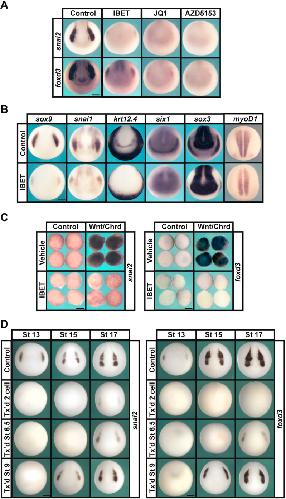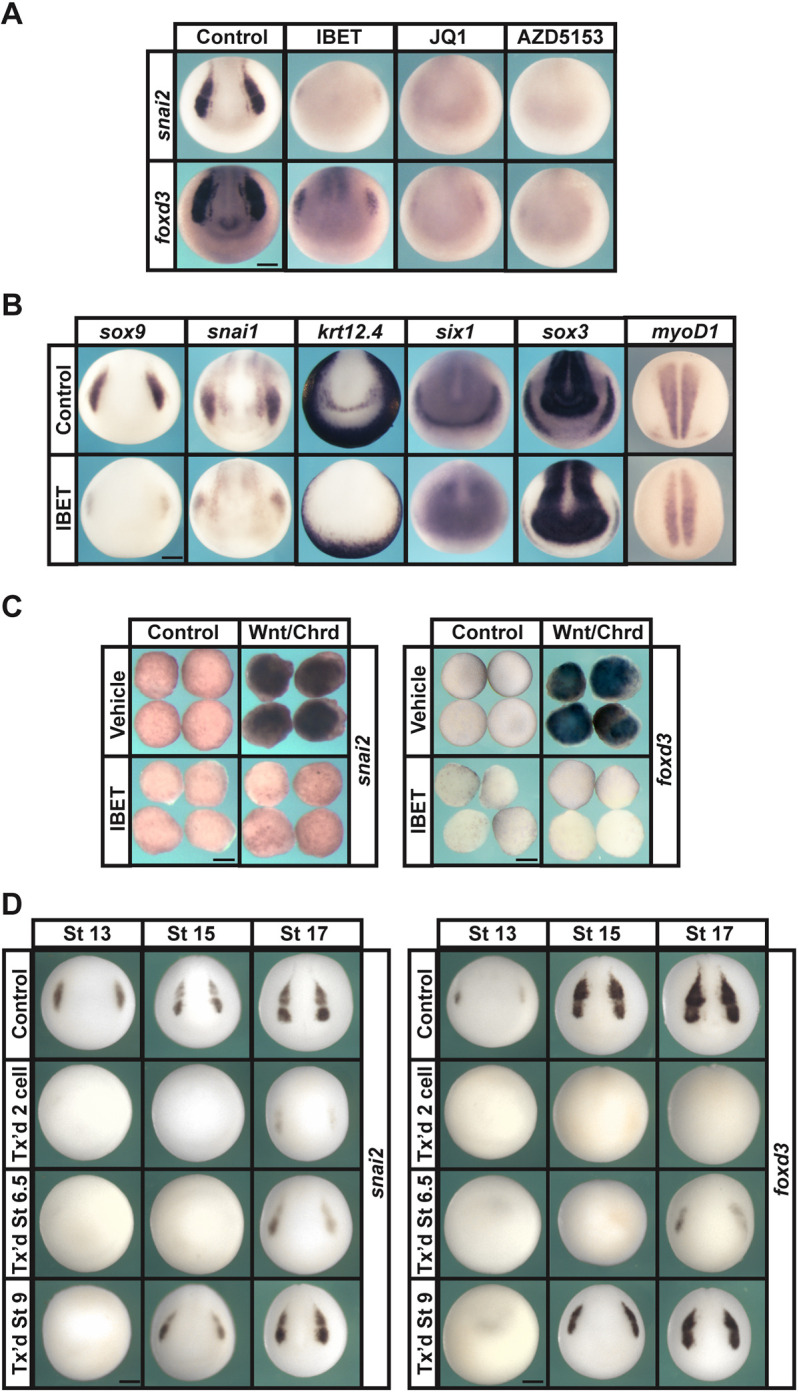 Fig. 1. BET activity is required for neural crest formation. (A) In situ hybridization examining the expression of neural crest factors snai2 and foxd3 following treatment with vehicle or inhibitor (250 µM IBET, 10 µM JQ1, 100 µM AZD5153). Embryos were collected at stage 15 (mid neurula). (B) In situ hybridization examining expression of neural crest factors sox9 and snai1, epidermal marker krt12.4, mesodermal marker myoD1, placodal marker six1 and neural plate marker sox3 following treatment with vehicle or IBET. Embryos were treated at two-cell stage and collected at stage 15 (mid neurula). (C) In situ hybridization examining expression of snai2 and foxd3 in Wnt/Chrd-induced explants treated with vehicle or IBET. Explants were collected at stage 18 (late neurula). (D) In situ hybridization examining expression of neural crest factors snai2 and foxd3 following treatment with vehicle or IBET at the indicated stage (two-cell, 6.5 or 9). Embryos were collected at stages 13, 15 or 17 (early, mid or late neurula, respectively). Scale bars: 250 μm. |