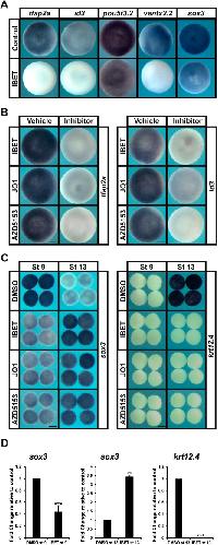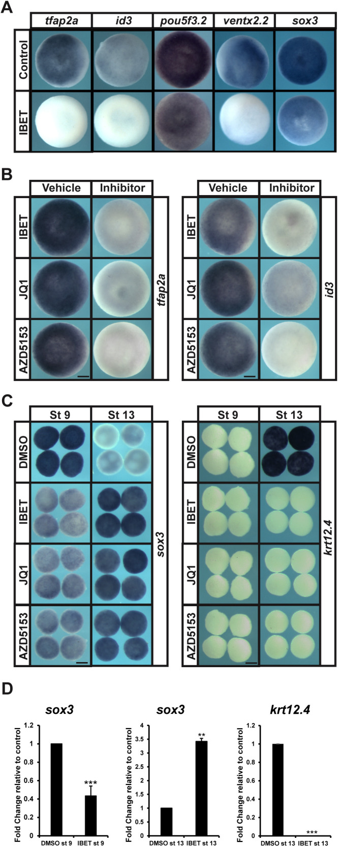 Fig. 2. BET activity is essential for expression of pluripotency genes and proper lineage restriction. (A) In situ hybridization examining expression of tfap2a, id3, pou5f3.2, ventx2.2 and sox3 in pluripotent blastula cells following treatment with vehicle or IBET (250 µM). Embryos were treated at the two-cell stage and collected at stage 9 (late blastula). (B) In situ hybridization examining expression of tfap2a or id3 in pluripotent blastula cells following treatment with vehicle or inhibitor (250 µM IBET, 10 µM JQ1, 100 µM AZD5153). Embryos were treated at the two-cell stage and collected at stage 9 (late blastula). (C) In situ hybridization examining expression of sox3 and krt12.4 in explanted blastula caps treated with vehicle or IBET. Embryos were treated at the two-cell stage, then explants were grown in culture with sibling embryos for staging purposes and collected at stage 9 (late blastula) and stage 13 (early neurula). (D) qRT-PCR of explanted blastula caps examining expression of sox3 or krt12.4 following treatment with vehicle or IBET (250 µM). **P<0.01, ***P<0.001 (standard two-tailed t-test with two sample equal variance). Data are mean±s.e.m. Explants were treated at the two-cell stage, then explants were grown in culture with sibling embryos and collected at stage 9 (late blastula) and stage 13 (early neurula). Scale bars: 250 μm. |