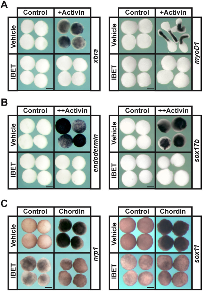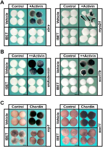 Fig. 3. BET activity is required for the pluripotency of blastula stem cells. (A,B) In situ hybridization examining expression of mesodermal markers (xbra and myoD1; A) and endodermal markers (endodermin and sox17b; B) in blastula explants induced with activin and treated with vehicle or IBET (250 µM). Embryos were treated at the two-cell stage, then explants were grown in culture with sibling embryos for staging purposes and collected at stage 11.5 (mid-gastrula) for xbra, endodermin and sox17b expression and stage 18 (late neurula) for myoD1 expression. (C) In situ hybridization examining expression of neural markers (nrp1 and sox11) in blastula explants induced with chrd mRNA and treated with vehicle or IBET. Embryos were treated at the two-cell stage and explants were collected at stage 18 (late neurula). Scale bars: 250 μm. |