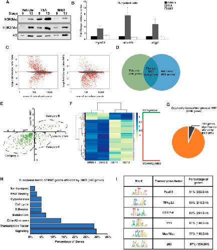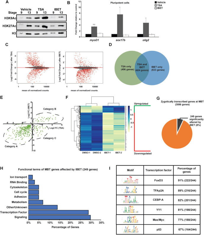 Fig. 4. BET activity is required for activation of a subset of genes at the maternal-to-zygotic transition. (A) Western blotting for H3K9Ac and H3K27Ac with animal cap explants treated with vehicle, TSA (500 nM) or IBET (250 μM). (B) qRT-PCR for lineage markers with animal cap explants treated with vehicle, TSA (500 nM) or IBET (250 μM). *P<0.05, ***P<0.001 (unpaired, two-tailed t-test). Data are mean±s.e.m. (C) MA-plot depicting global log2 fold gene expression changes in animal cap explants after TSA (left) or IBET (right) treatment. (D) Venn diagram comparing gene sets obtained from RNA-seq of animal cap explants treated with TSA/IBET. (E) Quadrant plot comparing log2 fold changes of genes altered by TSA and IBET. Category A includes genes downregulated by both TSA and IBET, category B includes genes upregulated by both TSA and IBET and category C includes genes upregulated by TSA but downregulated by IBET. (F) Heatmap of genes changed only by IBET but not TSA. (G) Pie chart depicting the genes zygotically transcribed at MZT that are affected by IBET. (H) Functional terms for zygotically transcribed mid-blastula transition (MBT) genes affected by IBET show enrichment for signaling molecules and transcription factors. (I) Motif analysis of promoters of genes altered by IBET at MBT. Enrichment is observed for transcription factor binding of known factors that have been previously characterized to be involved with BET proteins and have known functions in stem cell maintenance and neural crest formation. |