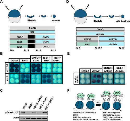 Fig. 7. Inhibition of BET activity prolongs competency to adopt a neural progenitor state. (A) Diagram of experimental design to test the competence of IBET-treated explants to respond to a neural-inducing BMP inhibitor past the time non-treated explants normally would. (B) In situ hybridization examining the expression of sox3 and krt12.4 in explanted blastula caps treated with vehicle or IBET (250 μM) from stages 9 to 11, washed into fresh 1× MMR, treated with BMPi (K02288) (20 μM) from stages 12 to 15 and then collected for analysis. Only explants treated with IBET then BMPi were able to induce a neural fate (as evidenced by expression of sox3 but not krt12.4) similar to that of explants treated with just BMPi. (C) Western blot analysis of stage 15 explants collected at same time as explants collected for in situ analysis with the same treatment schedule. Blot was probed with anti-pSmad-1,5,8 to assess levels of active BMP signaling, and anti-actin for normalization. pSmad-1,5,8 and actin were detected on the same membrane using the same secondary antibody. (D) Diagram of experimental design to test the competence of IBET-treated explants to respond to endoderm-inducing activin past the time non-treated explants normally would. (E) In situ hybridization examining expression of endodermin in explanted blastula caps treated with vehicle or IBET from stages 9 to 10.5, then treated with activin from stages 10.5 to 12, then collected for analysis. Only explants treated with activin at stages 9 through 12 showed increased expression of endodermin. (F) Model depicting two temporally distinct roles for Brd4 in the establishment and exit from pluripotency. Scale bars: 250 μm. |