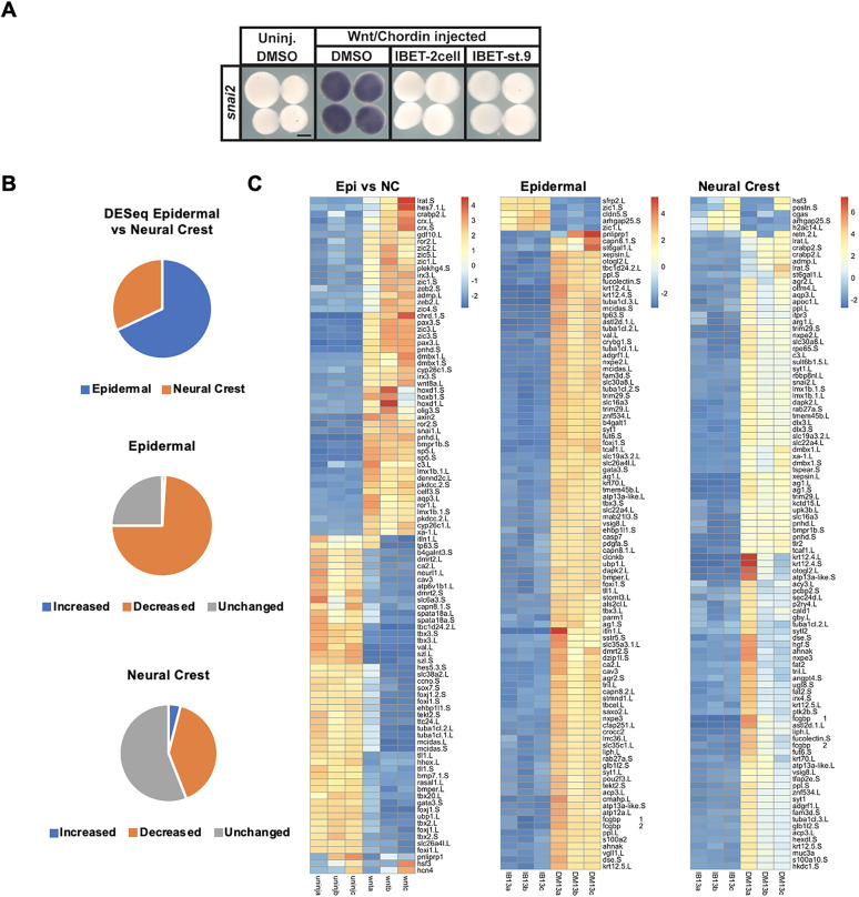 Fig. 5. Epidermal and neural crest progenitor cells possess unique gene signatures. (A) In situ hybridization examining the expression of snai2 in stage 13 Wnt/Chrd-induced explants treated with vehicle or IBET (250 μM), beginning at the two-cell stage or at stage 9. (B) Pie chart of stage 13 RNA-seq data depicting the percentage of epidermal and neural crest genes determined by comparing uninjected (epidermal) and Wnt/Chrd-induced (neural crest) explants using DESeq2 analysis, and pie charts depicting the effects of IBET treatment on those two different cell populations. (C) Heatmaps of the top 100 genes contributing to the variance between the cell populations compared in the pie charts in B. Scale bars: 250 μm. |