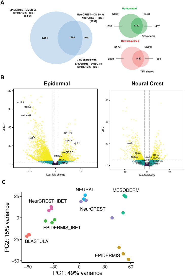 Fig. 6. Transcriptome changes in response to BET inhibition are shared across state transitions. (A) Venn diagrams depicting the overlap between genes found to be significantly altered using DESeq2 when comparing stage 13 epidermal explant response to IBET (250 μM) with stage 13 neural crest-reprogrammed explant response to IBET. Larger diagram compares total genes sets; smaller diagrams compare upregulated or downregulated gene sets. (B) Volcano plots of genes differentially expressed in stage 13 epidermal and neural crest explants in response to IBET. Genes noted are those that are downregulated in epidermal cells only (krt12.4.L, foxj1.S, mcidas.S, foxi1.S), downregulated in neural crest only (snai2.L, snai1.L, foxd3.S, pax3.L), and genes which are upregulated in both sets (efnb2.S, ccnd1.S, sgk1.L, sox11.S, sox3.S, zic1.L, pou5f3.2.S, not.L). (C) PCA plot comparing the variance between the transcriptomes of IBET-treated explants (EPIDERMIS_IBET, NeurCREST_IBET) and that of blastula and several other lineages (Neural, Mesoderm, Epidermis, NeurCREST). Aside from blastula-stage explants, explants of all other lineages were collected at stage 13. |