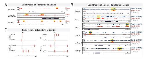 genes in blastula stem cells. (A) Genome browser view of Sox3 ChIP peaks at loci for