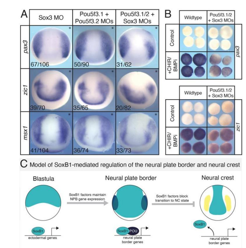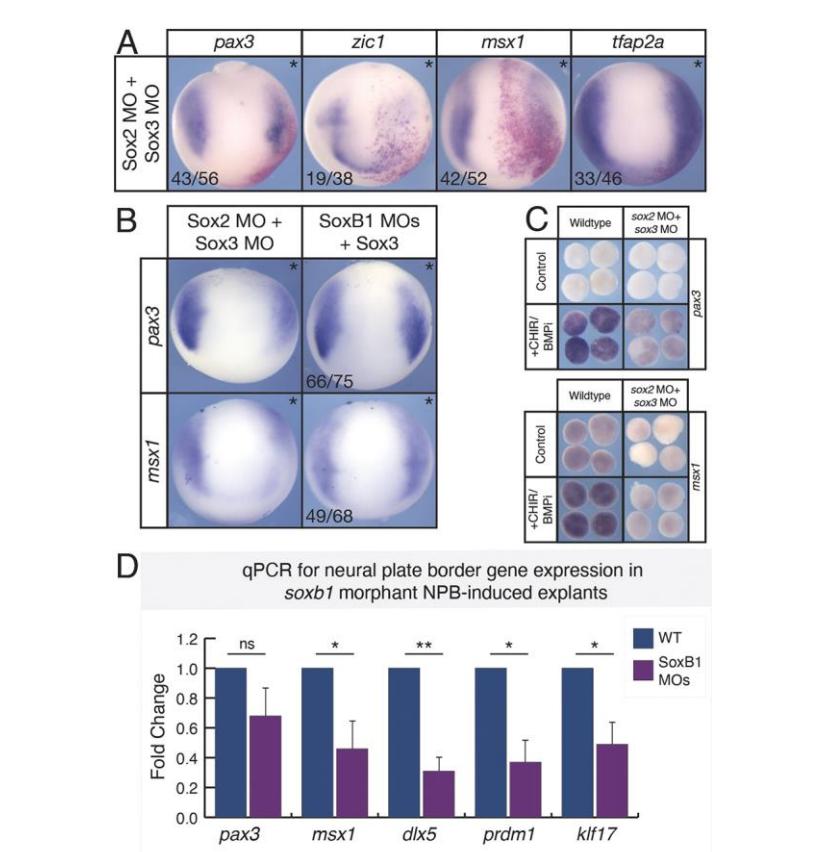 Fig. 2. SoxB1 factors are necessary for neural plate border formation. (A) In situ