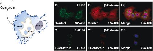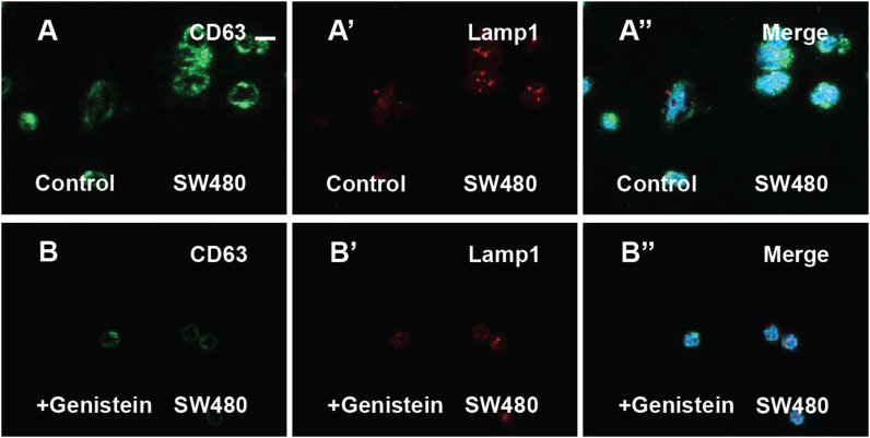 (C–C″) Cells with identical treatment as (B)-(B″) after the overnight genistein treatment (250 μM). Genistein treatment reduces both CD63 and