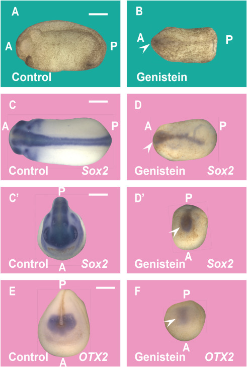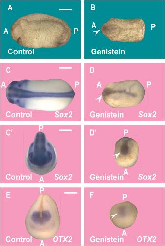 (B) Same as A after genistein treatment (500 μM) from the 4-cell stage until the 9.5 stage (early gastrula). Genistein treatment results in ventralized