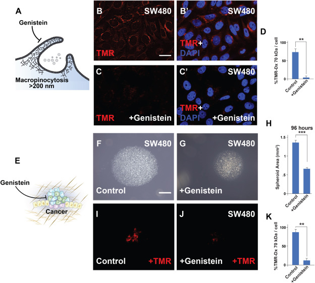 (A-D) Illustration of the cell membrane with genistein inhibiting macropinocytosis.