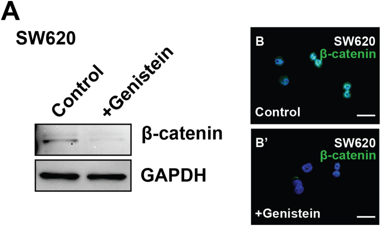 (E) Genistein + LiCl treatment. No increase in β-catenin levels.