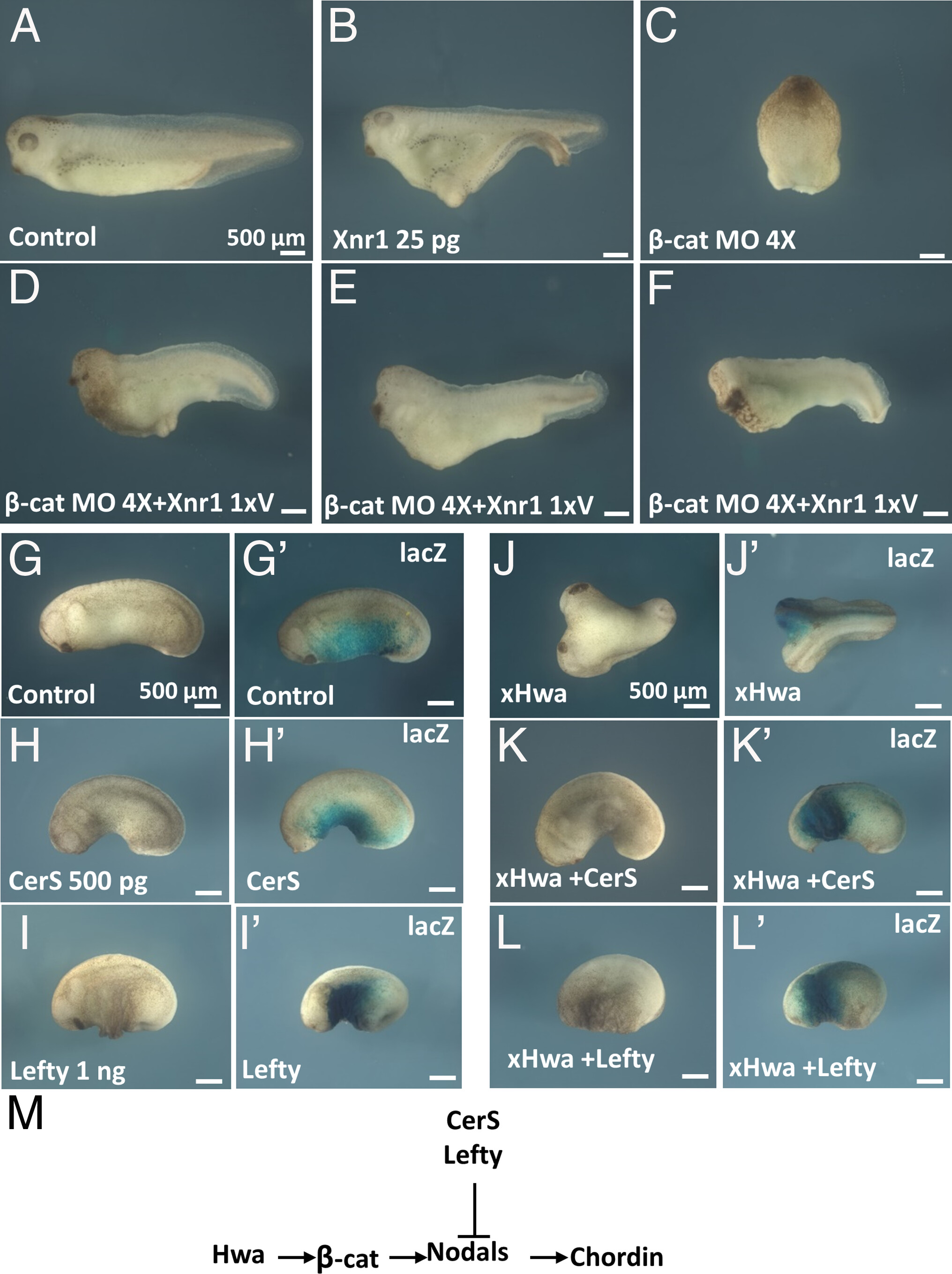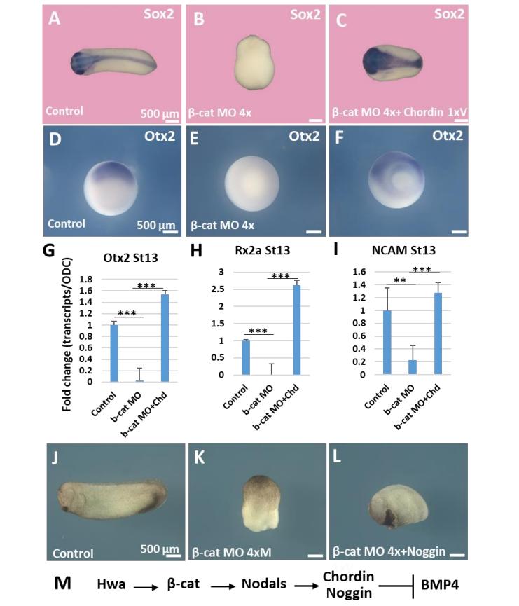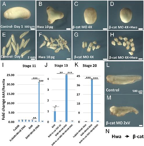 dorsalization. Scale bars: 500 µm. (M) Diagram for Hwa/β-catenin/Nodal/Chordin/BMP4